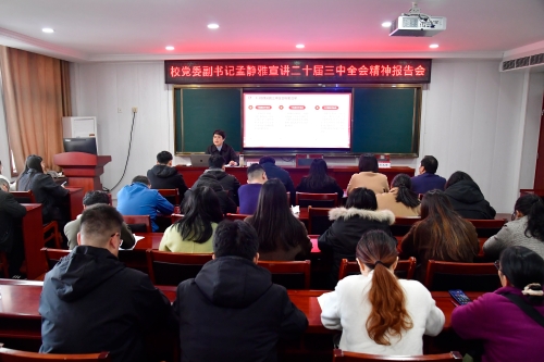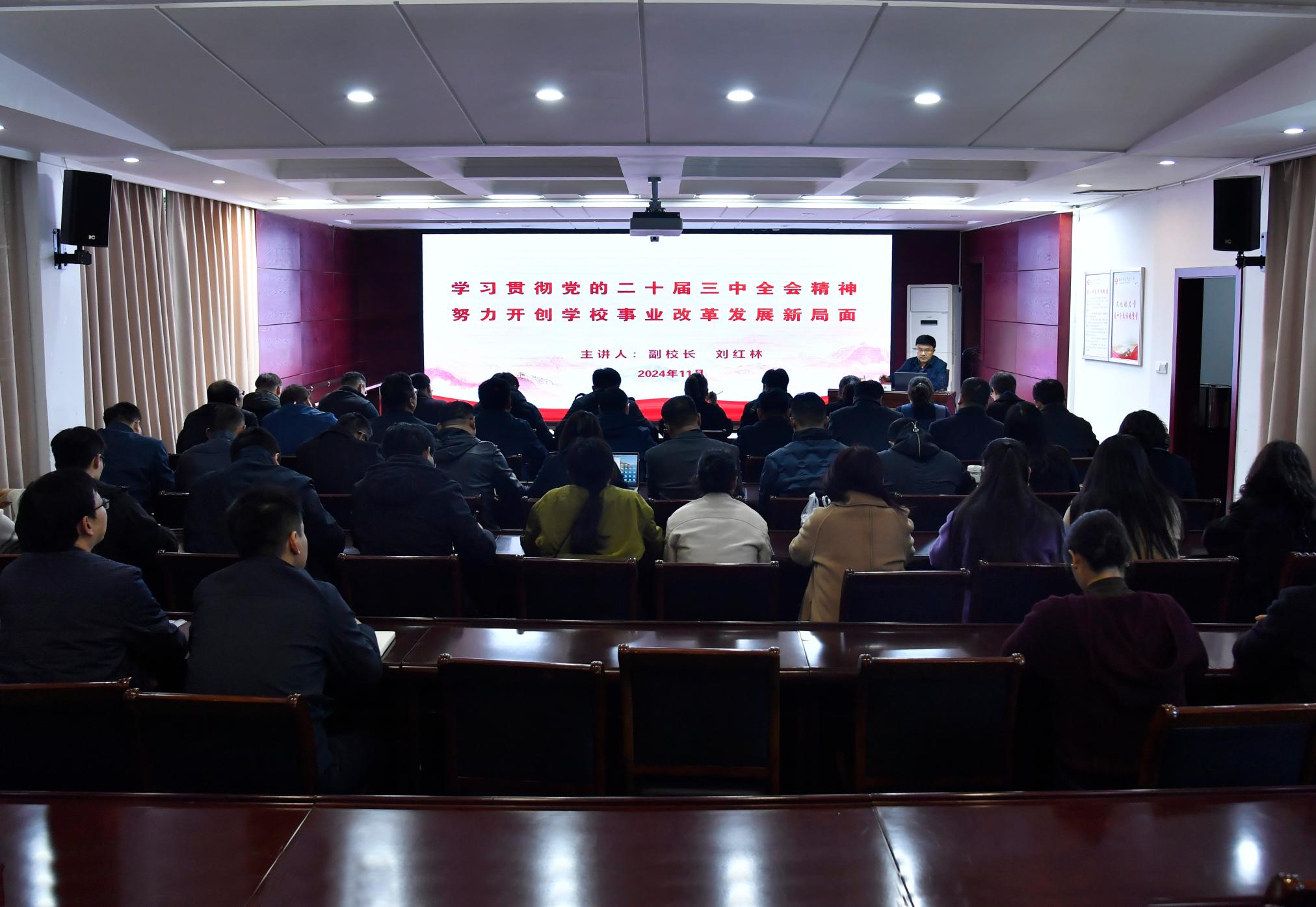 1报告会现场2报告会现场本网讯(王长宇/文杨静慧/图)11月20日下午,根据学校党委统一部署,副校长刘红林在办公大楼一楼东会议室作党的二十届三中全会精神宣讲报告。相关职能部门全体成员参加。刘红林以《学习贯彻党的二十届三中全会精神努力开创学校事业改革发展新局面》为题,从全会主题、全面深化改革的重要性和必要性、重大原则等6个方面,宣讲了习近平总书记在党的二十届三中全会上的重要讲话精神;从经济体制改革、民主和法治领域改革、文化体制机制改革等8个方面,讲解了全面准确理解《决定》提出的进...