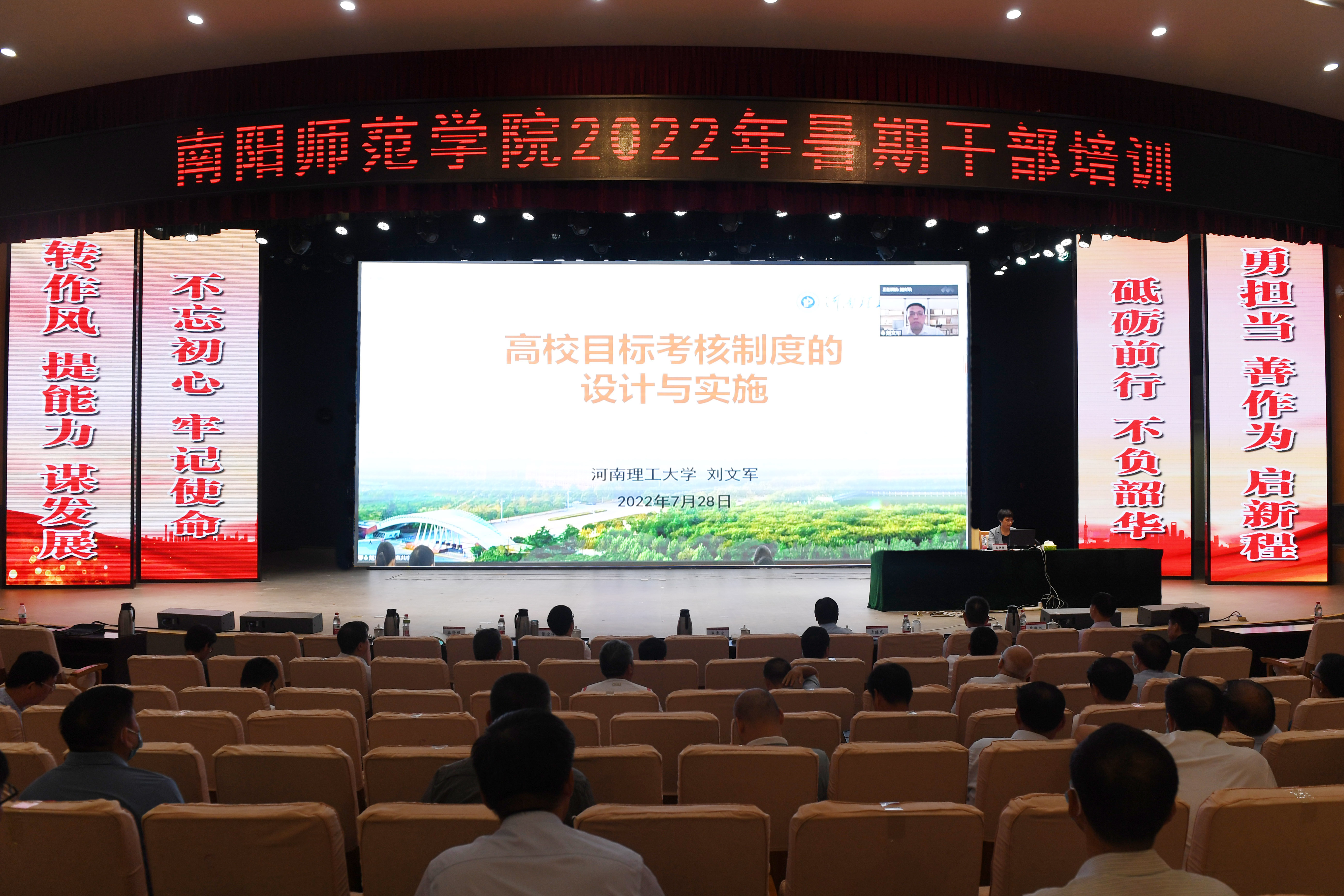 1.河南理工大学校长办公室副主任刘文军作专题辅导报告2.会场现场本网讯(王治国/文 李欣然/图)7月28日下午,河南理工大学校长办公室副主任刘文军应邀为新葡萄官网2022年暑期干部培训班作了题为《高校目标考核制度的设计与实施》的专题辅导报告。报告会由副校长孟静雅主持。刘文军结合河南理工大学的具体实践,从高校实施目标考核制度的依据和意义、河南理工大学目标考核制度的实践探索、制定目标考核制度的启示等三个方面详细阐述了...