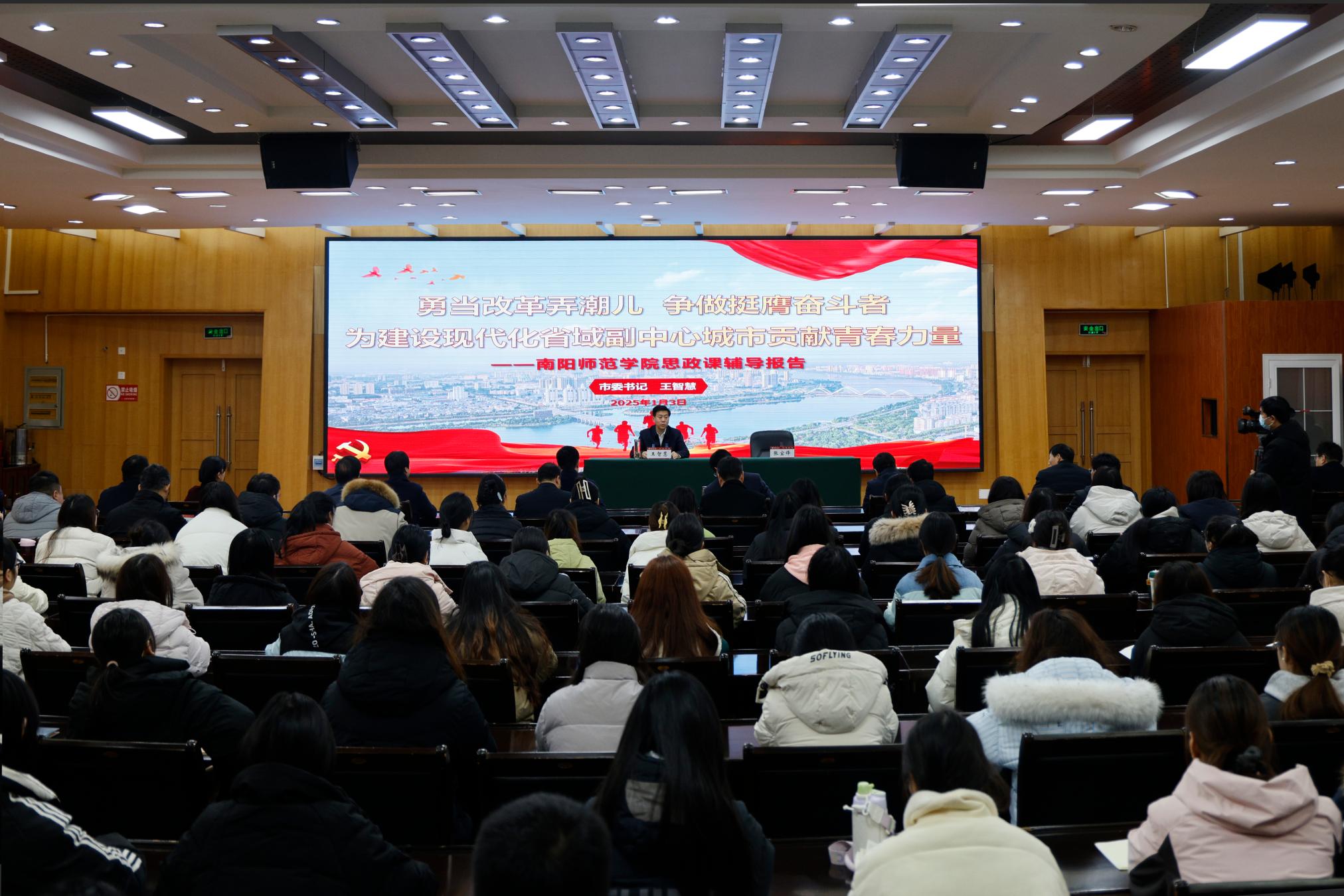 1月3日上午,南阳市委书记王智慧在南阳市委常委、秘书长李鹏,副秘书长、市委改革办主任卫朝辉陪同下来校讲授思政课。校领导张宝锋、罗永松、孟静雅、熊新忠、王岩、谢海泉以及马克思主义学院师生代表共200余人参加。报告会由校党委书记张宝锋主持。王智慧围绕深入学习贯彻党的二十届三中全会精神,以《勇当改革弄潮儿,争做挺膺奋斗者,为建设现代化省域副中心城市贡献青春力量》为题,从“...