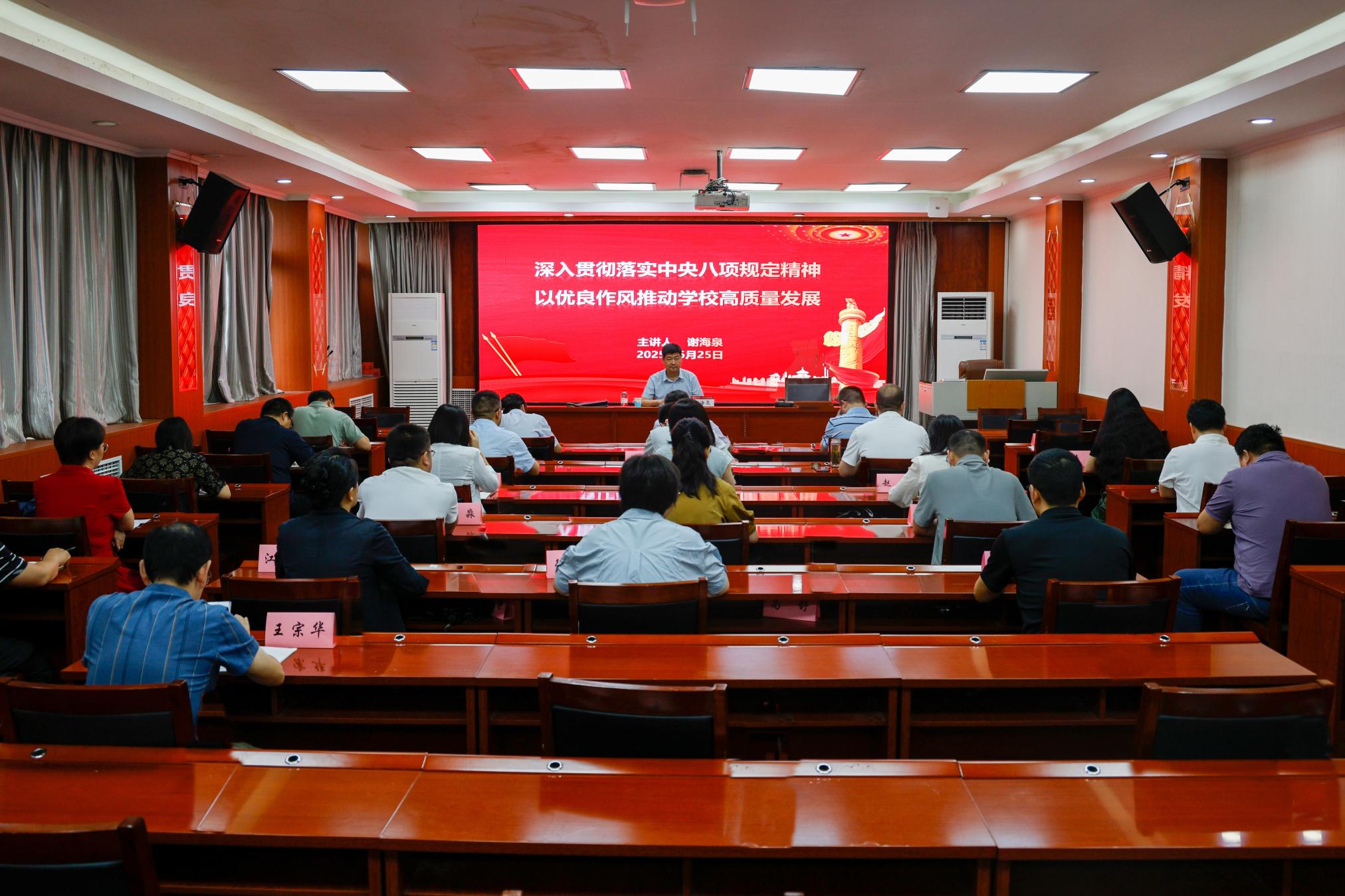 为推进深入贯彻中央八项规定精神学习教育,教育引导党员干部深刻把握中央八项规定精神核心要义与实践要求,6月23日下午,副校长熊新忠在办公大楼一楼东会议室,以《深入贯彻中央八项规定精神 以扎实作风建设促进学校事业高质量发展》为主题讲授专题党课。相关职能部门和学院参加学习。熊新忠以习近平总书记在河南考察工作时发表的重要讲话为指导,讲授了中央八项规定、中央八项规定精神的主要内涵,深入贯彻中央八项规定精神的重要意义,以及中央八项规...