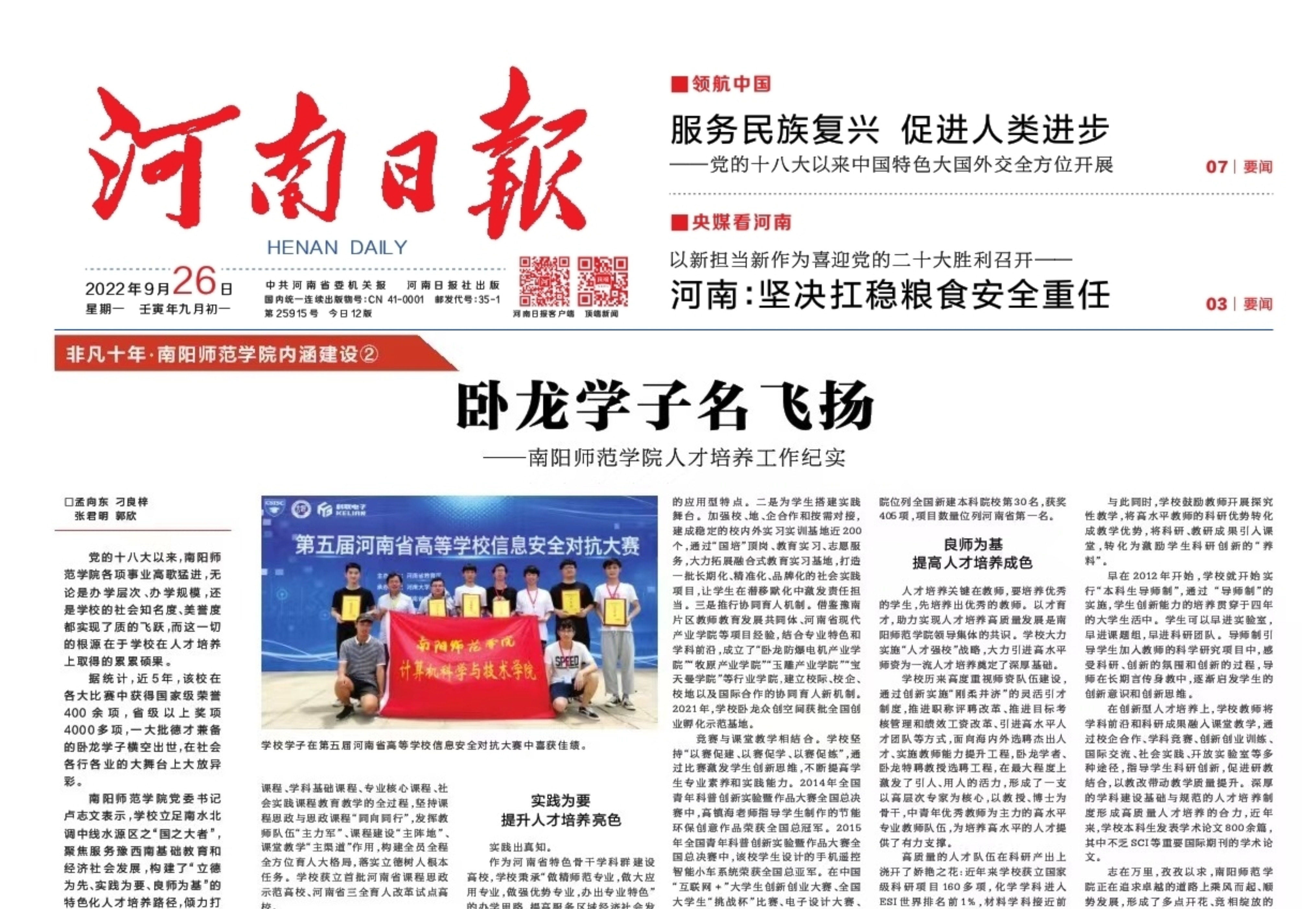 2022年9月26日,《河南日报》“非凡十年·新葡萄8883官网AMG内涵建设”栏目刊发新葡萄8883官网AMG系列文章②《卧龙学子名飞扬——新葡萄8883官网AMG人才培养工作纪实》,现全文转载如下:□孟向东 刁良梓 张君明 郭欣党的十八大以来,新葡萄8883官网AMG各项事业高歌猛进,无论是办学层次、办学规模,还是学校的社会知名度、美誉度都实现了质的飞跃,而这一切的根源在于学校在人才培养上取得的累累硕果。据统计,近5年,该校在各大比赛中获得国家级荣...