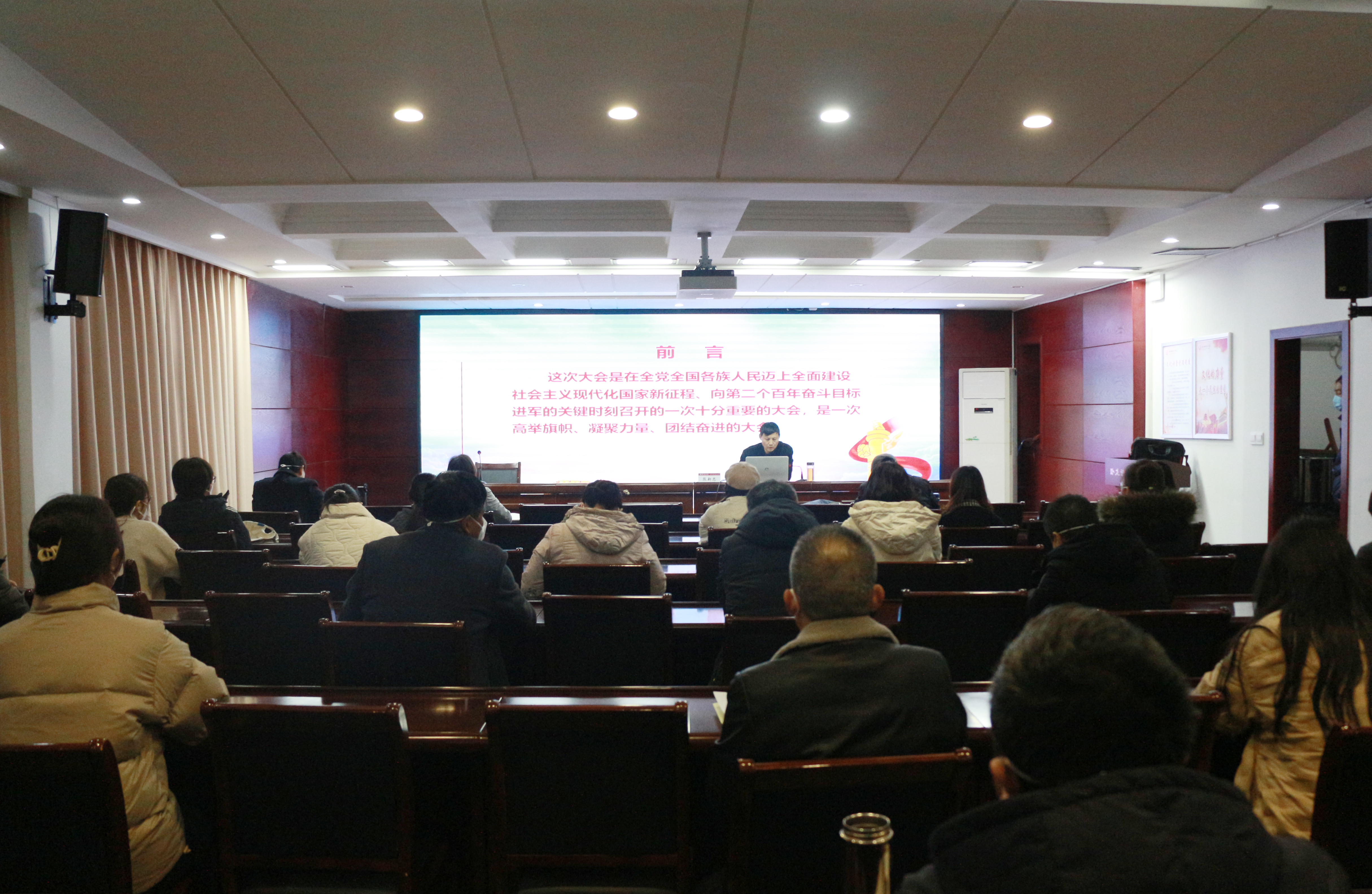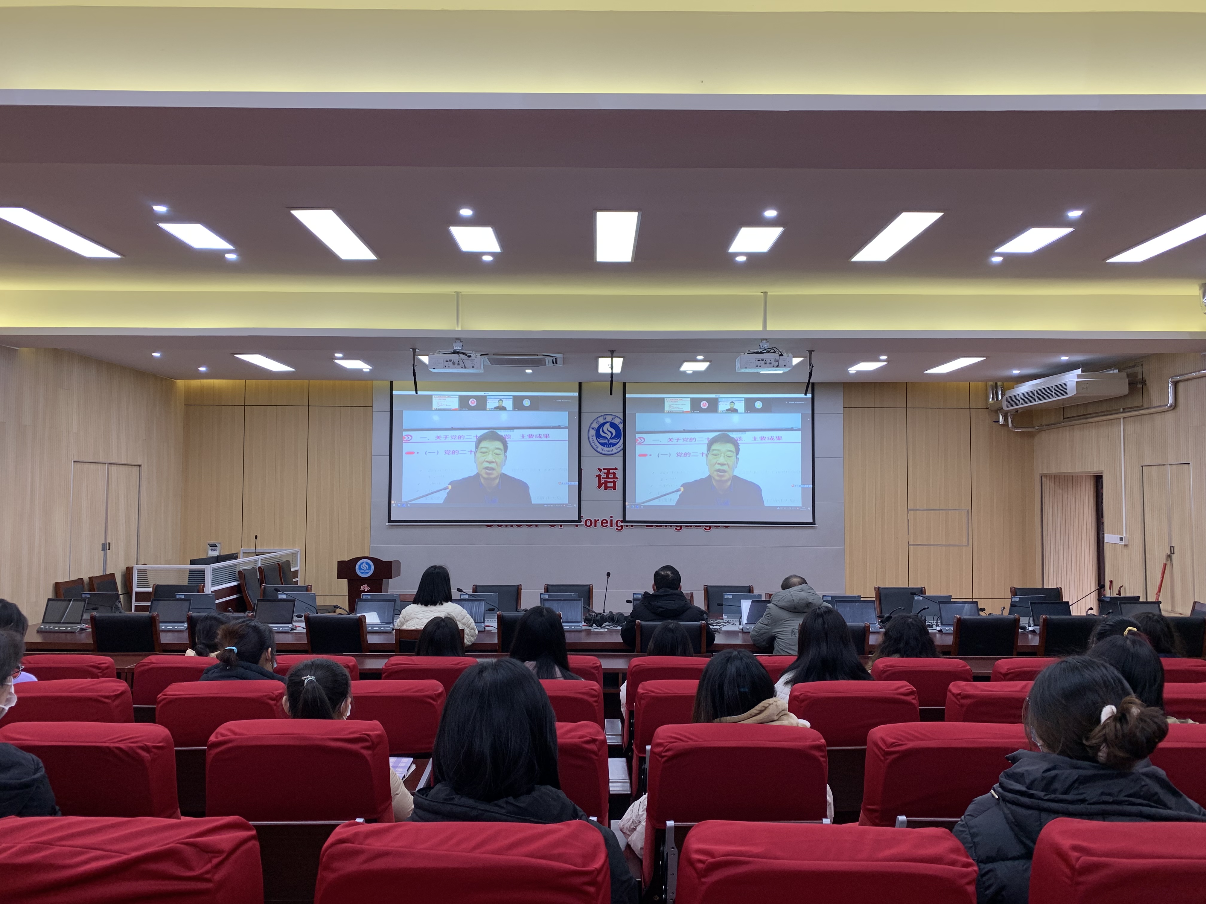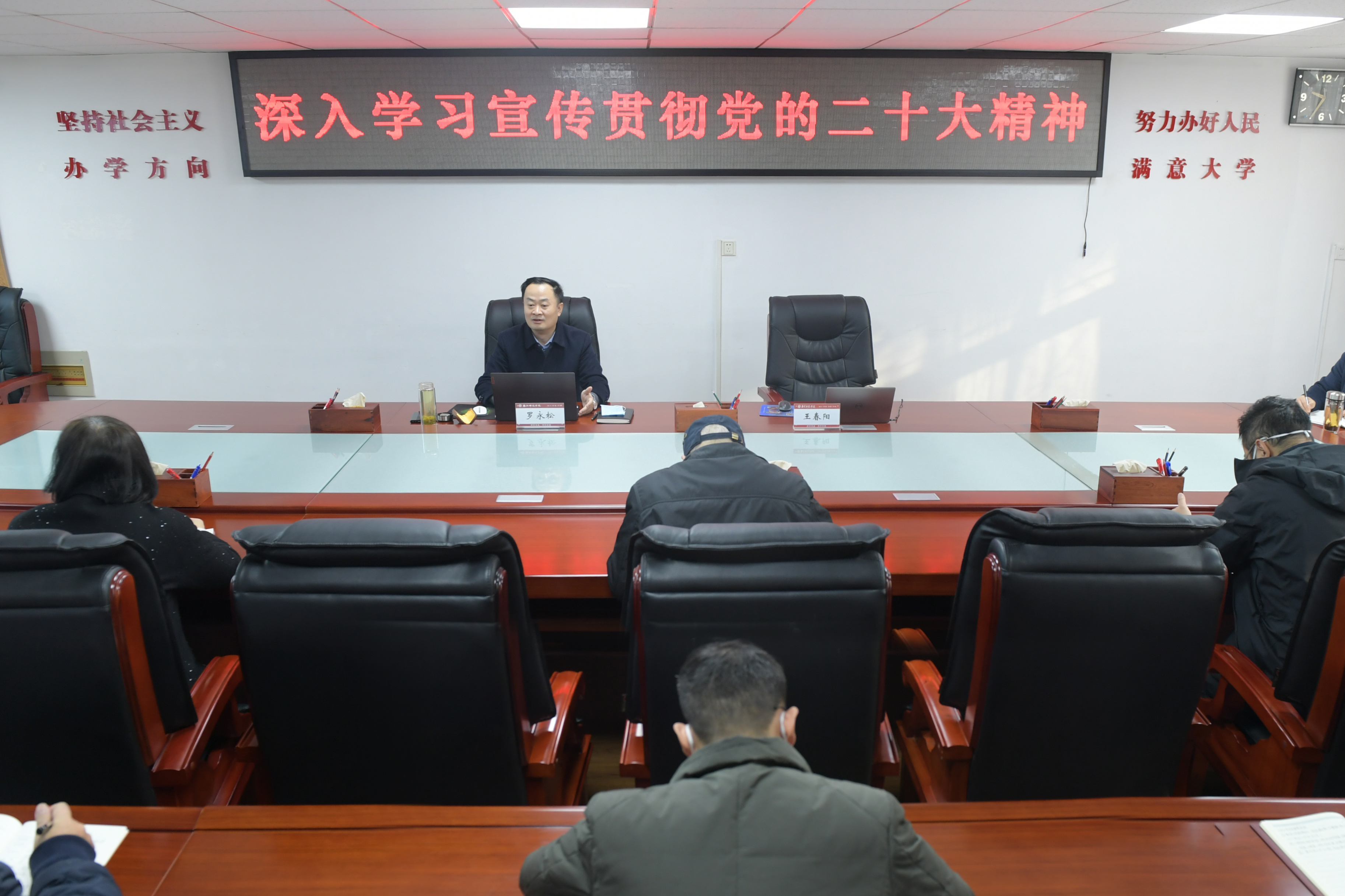 本网讯(王华根/文 王宏洋/图)12月7日下午,副校长朱其春在办公大楼一楼东会议室采取线上和线下相结合的模式,做党的二十大精神专题宣讲。保卫处、基建处、校医院、外国语学院、体育学院师生代表参加报告会。会议由保卫处处长宋荣岚主持。朱其春从“党的二十大的主题、主要成果”“关于过去5年的工作和新时代10年的伟大变革”“关于马克思主义中国化时代化”“关于中国式现代化”“关于全面建设社会住院现代化国家的目标任务...