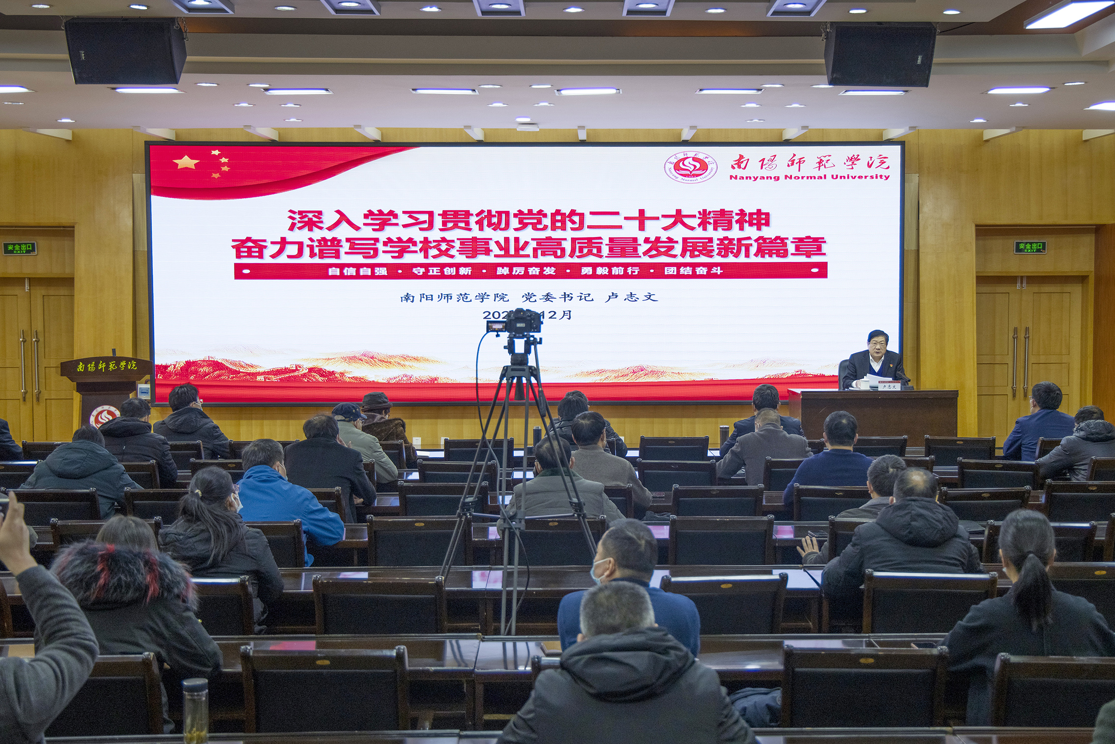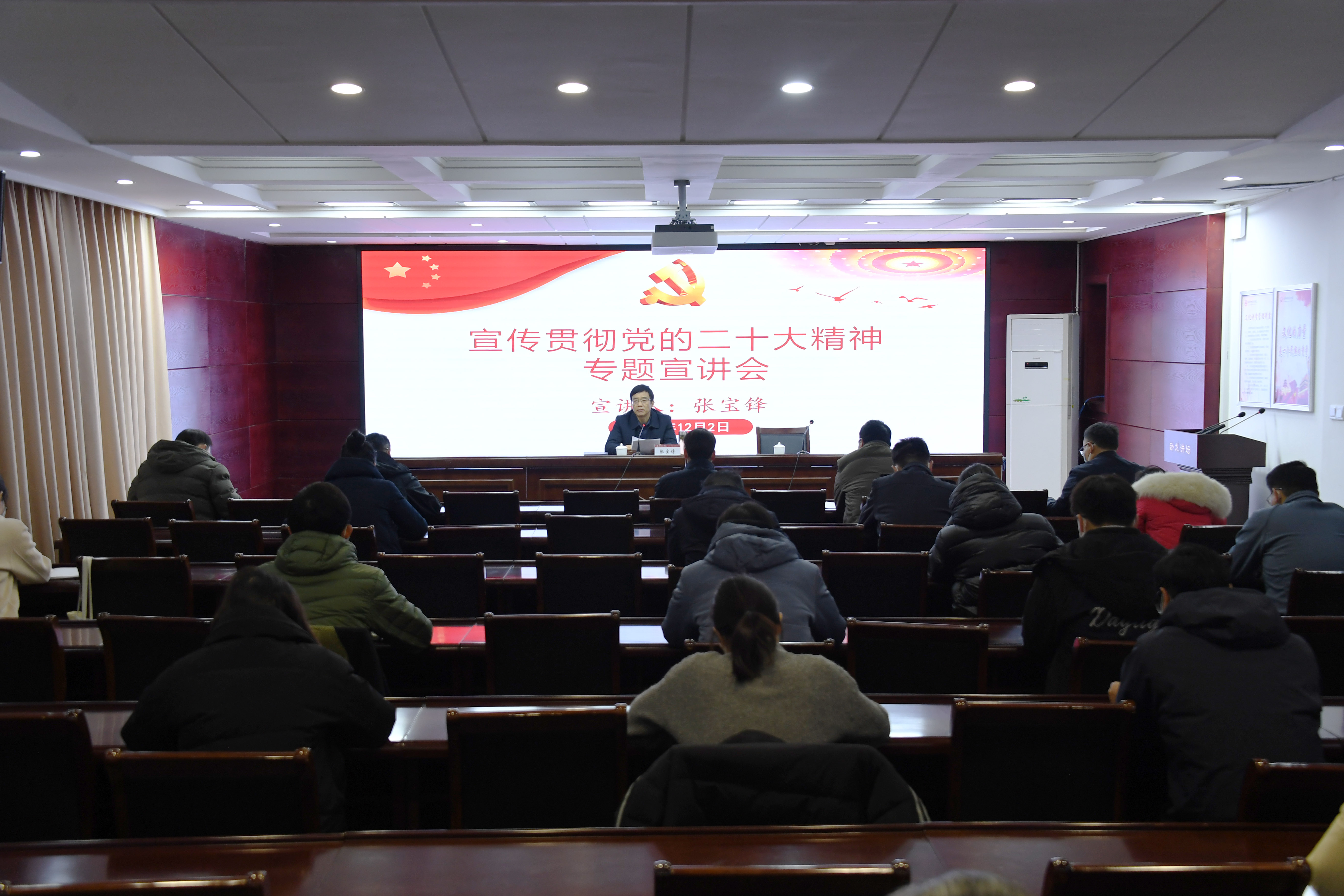 1.会议现场2.校长张宝锋作报告3.会议现场本网讯(王一鸣/文 李欣然/图)12月2日,校长张宝锋在办公大楼一楼东会议室作宣传贯彻党的二十大精神专题宣讲。院长办公室、校友办工作人员以及水资源与环境工程学院、法学院师生代表参加。宣讲会由院长办公室主任冷枫主持。张宝锋从六个方面对党的二十大精神进行了深入讲解。第一个方面讲解了党的二十大召开的意义,第二个方面总结了党的十八大以来新时代十年的伟大变革,第三个方面深...