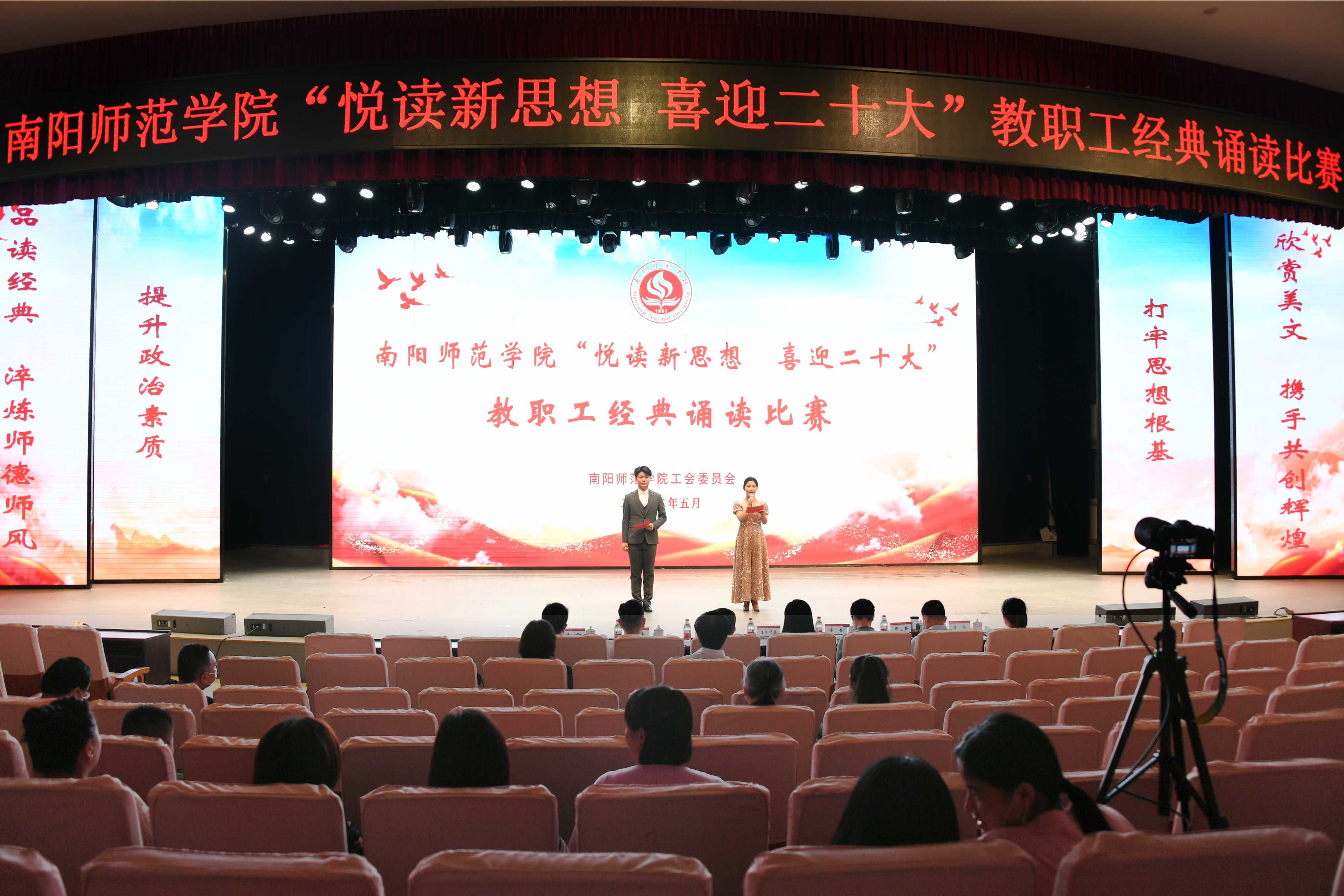 1.比赛现场22.比赛现场本网讯(高宛莉/文 王袁庆/图)5月25日下午,由校工会举办的新葡萄8883官网AMG“悦读新思想 喜迎二十大”教职工经典诵读比赛在音乐厅拉开帷幕。校党委副书记、工会主席邵书峰出席活动。本次比赛同时通过新葡萄8883官网AMG官方微博进行网络直播。本次比赛共有30支代表队138人参加,经过各参赛队饱含深情地诵读和评委的现场评分,来自党群机构分会的参赛作品《诗颂风华》、新闻与传播学院分会的参赛作品《中国报告》《...