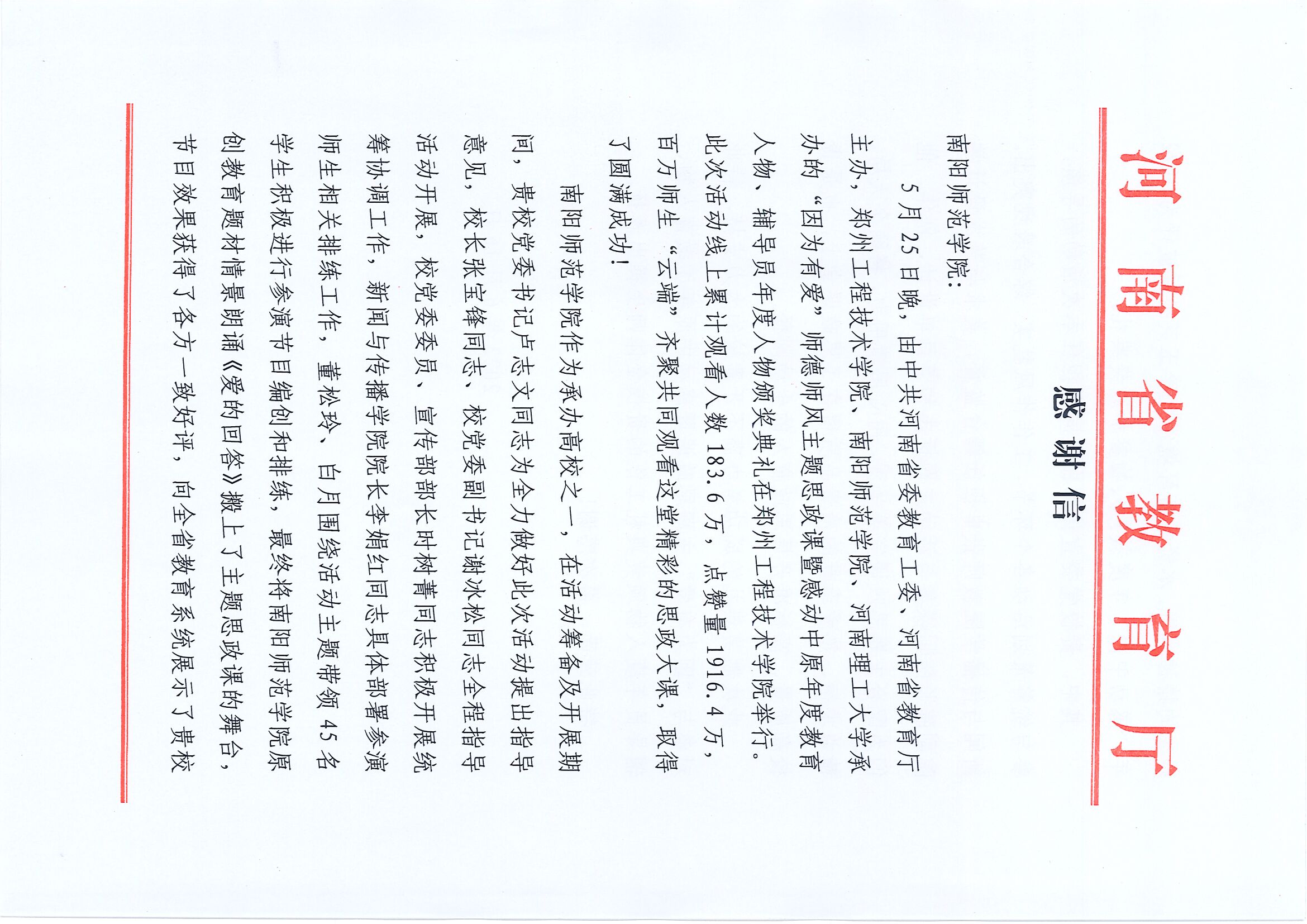 近日,新葡萄官网收到河南省教育厅的感谢信,对新葡萄官网参与承办的“因为有爱”主题思政课暨感动中原年度教育人物、辅导员年度人物颁奖典礼所作出的贡献予以高度评价,并表示肯定和感谢。据悉,5月25日晚上7:30,由省委教育工委、省教育厅主办,郑州工程技术学院、新葡萄8883官网AMG、河南理工大学承办的“因为有爱”师德师风主题思政课暨感动中原年度教育人物、辅导员年度人物颁奖典礼在郑州工程技术学院举办。省委...