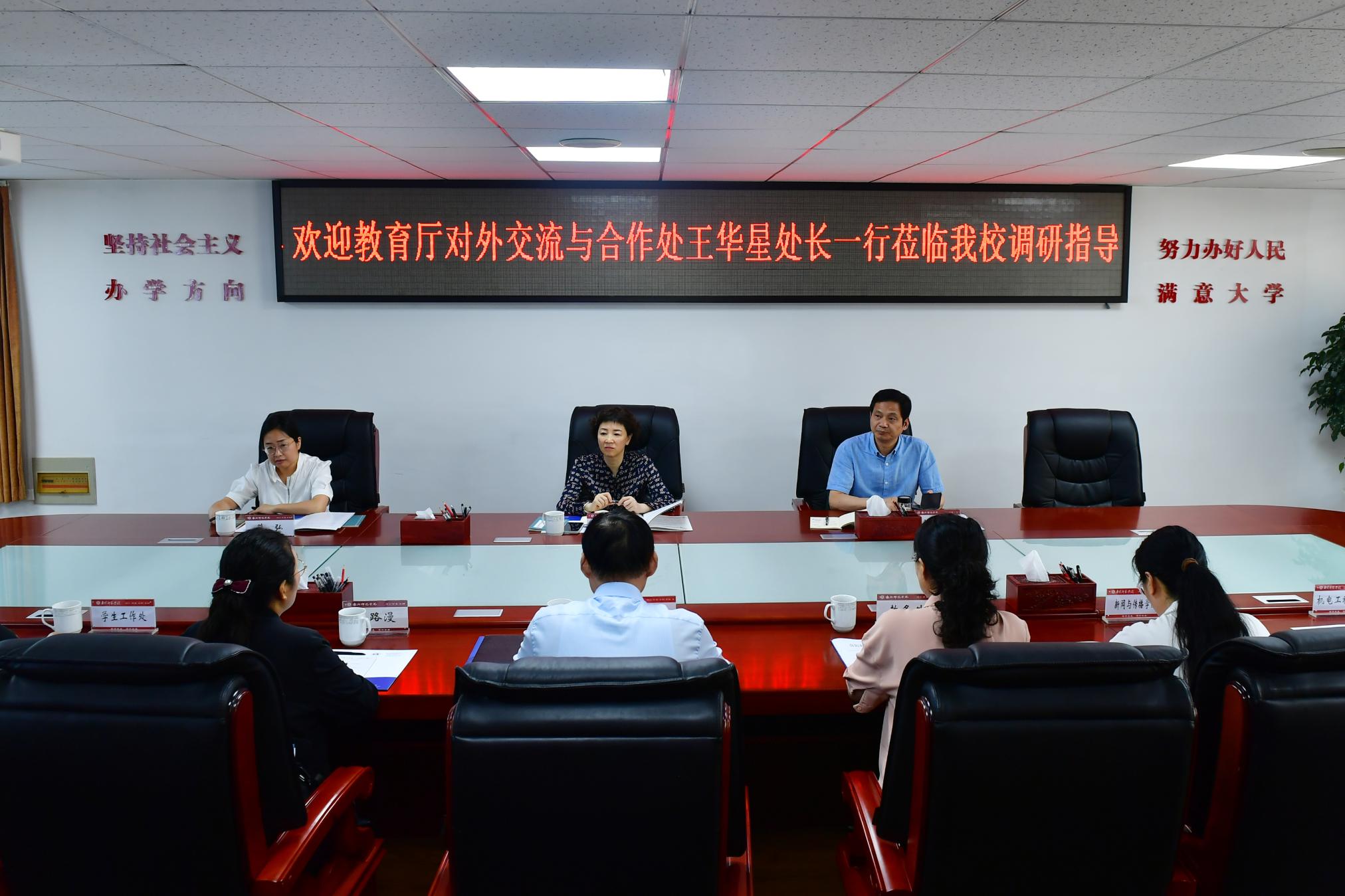 08月22日上午,河南省教育厅对外合作与交流处处长王华星、一级调研员陈兆武、副处长蔡弘一行三人莅临新葡萄官网调研指导工作。座谈会在办公大楼三楼会议室召开,副校长熊新忠出席并主持。相关单位负责人参加。熊新忠对王华星一行的到来表示欢迎,他简单介绍了新葡萄官网的基本情况及近年来国际化办学的情况,就新葡萄官网对外交流、科研合作、教师海外研修、中外合作办学、对外中外教育、留学生培养...