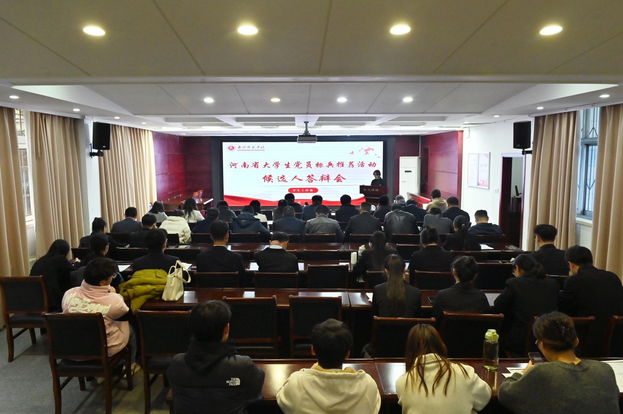 11月28日下午,新葡萄官网在办公大楼一楼东会议室举行河南省大学生党员标兵推荐活动候选人答辩会。副校长刘红林出席。校党委组织部、党委学工部等相关部门负责同志及候选人所在学院党委书记受邀担任评委。答辩会由学生处处长付中欣主持。本次评选经过学生党支部推荐、学院初评环节,最终遴选出18名本科生、2名研究生学生党员进入现场答辩。候选人依次答辩后,评委老师综合党员事迹材...