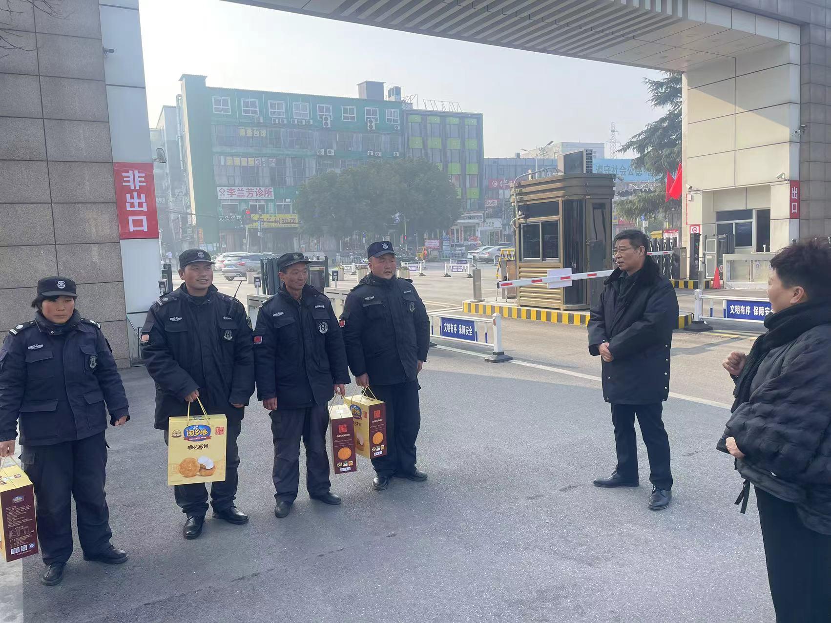 慰问现场本网讯(通讯员王华根图/文)2月9日,副校长朱其春带领保卫处班子成员及各科室负责人对校园春节安全进行全面巡查检查,并看望慰问学校春节期间坚守岗位的保卫工作人员和一线保安队员。朱其春代表学校对保卫工作人员过去一年的辛勤付出表示感谢,对在春节期间坚守在工作岗位的同志表示诚挚的慰问,祝愿大家新年快乐,阖家幸福,万事如意,并为除夕当天依然辛勤工作的值班人员送去了慰问礼品。每到一处值班岗点,他都与值班人员亲切握手,对保卫处全体人员在校园安全工作上的突出贡献给予了充分的肯定,对他们...