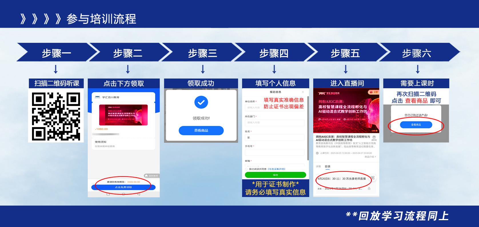 课程兑换:按照下方参与培训流程图,微信扫码兑换课程(注意:填写个人信息时,一定要正确填写工号、姓名等信息,确保后期能正常下载证书)。