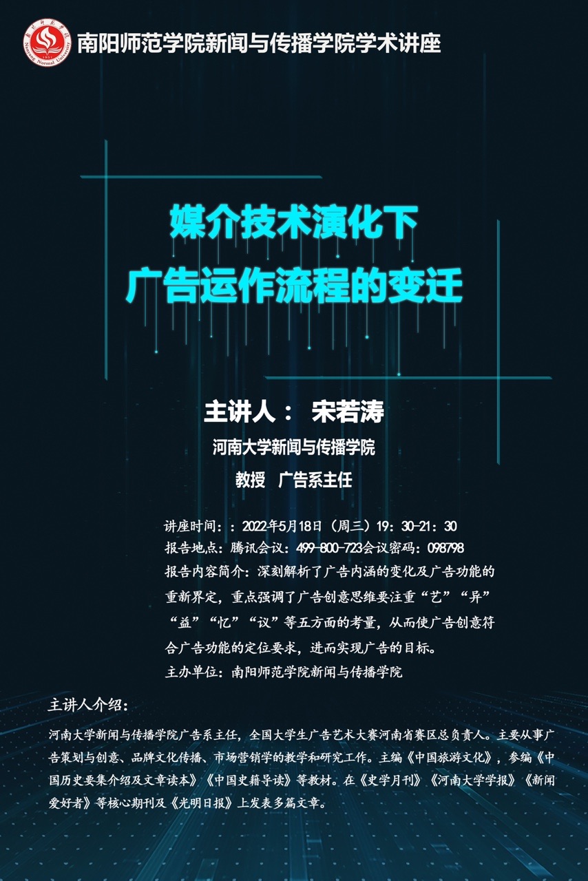 报告人简介:宋若涛教授,河南大学新闻与传播学院广告系主任,全国大学生广告艺术大赛河南省赛区总负责人。主要从事广告策划与创意、品牌文化传播、市场营销学的教学和研究工作。主编《中国旅游文化》,参编《中国历史要集介绍及文章读本》《中国史籍导读》等教材。在《史学月刊》《河南大学学报》《新闻爱好者》等核心期刊及《光明日报》上发表多篇文章。本次报告将深刻解析广告内涵的变化及广告功能的重新界定,重点强调了广告创意思维要注重“艺”“异”“益”“忆”“议”等五方面的考量,从而使广告创意符合广告功能的定位要求,进而实现广告的目标。