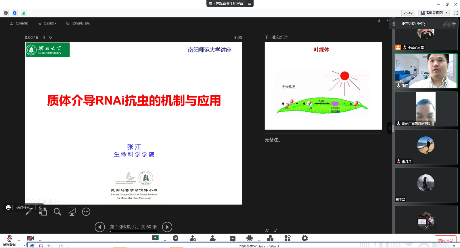 (通讯员 杨树琼文/图)11月25日上午,应生命科学与农业工程学院邀请,湖北大学“楚天学者”特聘教授张江,通过线上形式为新葡萄官网师生做了题为“质体介导RNAi抗虫的机制与应用”的学术报告,报告会由生命科学与农业工程学院院长姚伦广主持。