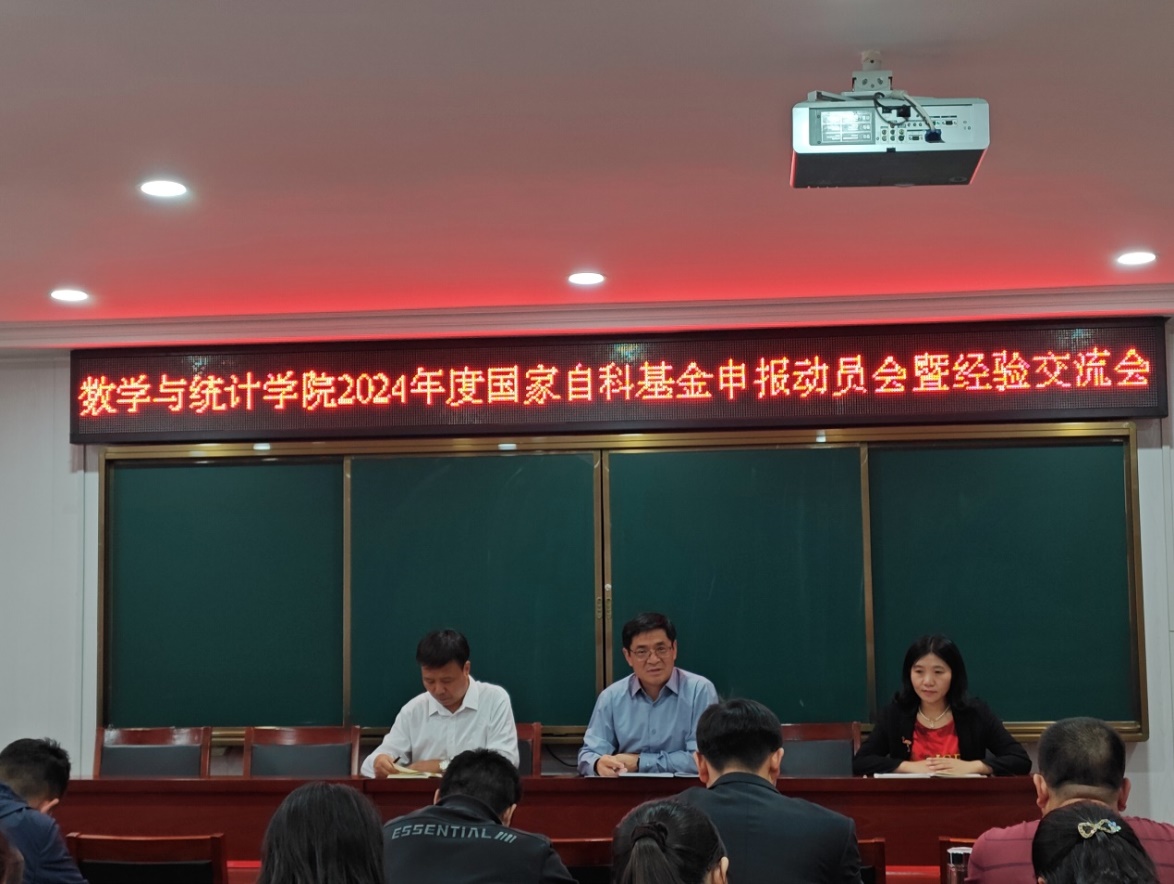 本网讯(韩雨阳/文图)为做好2024年度国家自然科学基金项目申报工作,促进学院科研工作良好发展,9月27日下午,数学与统计学院在逸夫楼S504举行了2024年度国家自然科学基金项目申报动员会暨经验交流会。数学与统计学院党委书记张顺安、院长王顺钦、副院长谭冰以及学院的科研骨干教师代表参加会议。