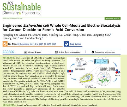 (通讯员 唐存多)近日,生物催化领域国际知名期刊ACS Sustainable Chem. Eng.在线发表了新葡萄官网生命科学学院生物催化与合成生物学姚伦广教授团队题为“Engineered Escherichia coli Whole Cell-Mediated Electro-Biocatalysis for Carbon Dioxide to Formic Acid Conversion”的研究成果。《ACS Sustainable Chem. Eng.》是美国化学会新兴的旗舰期刊,被公认为国际生物催化领域的顶尖杂志之一,目前影响因子为8.7,属于化学学科Top期刊、中科院1区期刊。新葡萄官网史红玲老师为该论文的第一作者,新葡萄8883官网AMG为第一完成单位,新葡萄官网姚伦广教授、唐存多博士和大连理工大学薛闯教授为共同通讯作者。