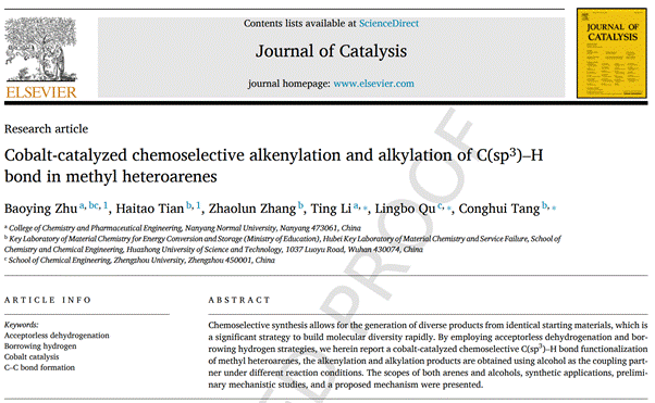 近日,化学与制药工程学院光电绿色催化与药物合成研究团队在《Journal of Catalysis》上发表题为“Cobalt-catalyzed chemoselective alkenylation and alkylation of C(sp3)–H bond in methyl heteroarenes”的研究论文。该期刊为中科院SCI大类一区,最新影响因子为7.3。化学与制药工程学院硕士研究生朱保颖为论文第一作者,李亭教授为通讯作者,新葡萄8883官网AMG为该论文第一署名单位。