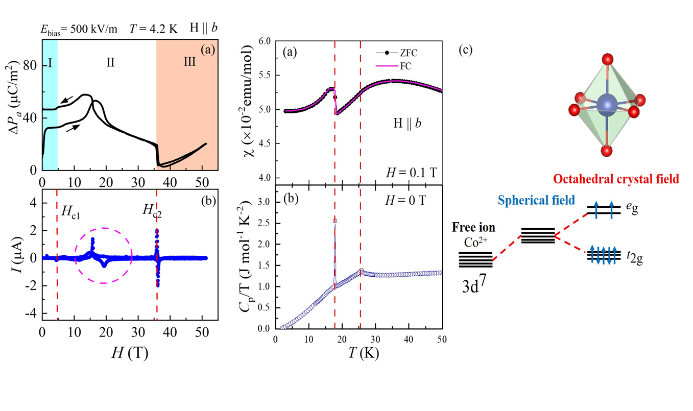 在此项研究中,刘从斌博士报道了新型的方法生长出多铁性材料Co3TeO6单晶,并研究了其在60 T强磁场下的磁相变和磁致铁电极化行为,并阐述了铁电极化产生的物理机制。研究发现磁场H//b时磁化强度曲线在Hc1和Hc2揭示了两个新的spin-flop磁相变;铁电极化与磁场的关系曲线形成了三个铁电区域相I, II,和III,其边界兼容于磁相变的临界场Hc1和Hc2,说明铁电相与磁相之间存在强烈的关联性,铁电极化受控于磁性序参量的演变过程。磁化率上磁矩的跳变行为与比热Cp/T的一级相变是兼容的,可能与Co2+离子t2g轨道简并态消除有关,也可能与电荷重新分布形成的电荷密度波有关。该研究为探究复杂磁电耦合体系中自旋、轨道和晶格等对铁电极化的调制行为提供了新的研究视角。