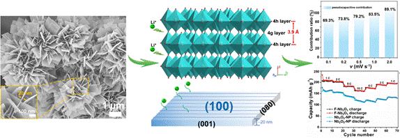 正交相Nb2O5(T-Nb2O5)具有由NbO6和NbO7两种多面体共顶点或共边连接而成的层状结构,Li+能够在其(001)平面实现快速扩散。因此,对T-Nb2O5的结构进行设计,使其暴露更大比例的(100)晶面,并减小Li+在(001)平面的扩散距离,有利于提升锂离子电池的快充性能。另外,T-Nb2O5具有较低的电子电导率,限制了其在高倍率下的充放电性能,对其进行非金属掺杂有利于改善其本征电子电导率。储能材料与器件研究团队采用拓扑转化法调控合成了F掺杂T-Nb2O5微米花(F-Nb2O5),其暴露近97%的(100)晶面,最大限度地增加了Li+的有效传输通道,从而有效提高Li+的嵌入性能。此外,由于F原子的掺杂,F-Nb2O5的带隙降低到2.87 eV,从而提高了导电性。由于F-Nb2O5的特殊结构,其表现出优异的倍率性能和良好的高倍率循环性能。该研究证实了晶面工程和掺杂工程有利于实现Li+的快速存储,为快充锂离子电池负极材料的设计提供了新思路。