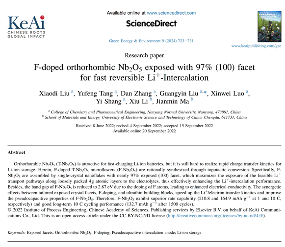 本网讯(通讯员 邢小静/文 图)近日,化学与制药工程学院纳米储能材料研究团队在《Green Energy & Environment》上发表题为“F-doped orthorhombic Nb2O5exposed with 97% (100) facet for fast reversible Li+-Intercalation”的研究论文。《Green Energy & Environment》是关注绿色能源与环境领域的期刊,为中科院SCI大类一区,最新影响因子为13.3。新葡萄官网刘小娣博士为论文第一作者,刘光印博士为通讯作者,新葡萄8883官网AMG为该论文的第一署名单位。