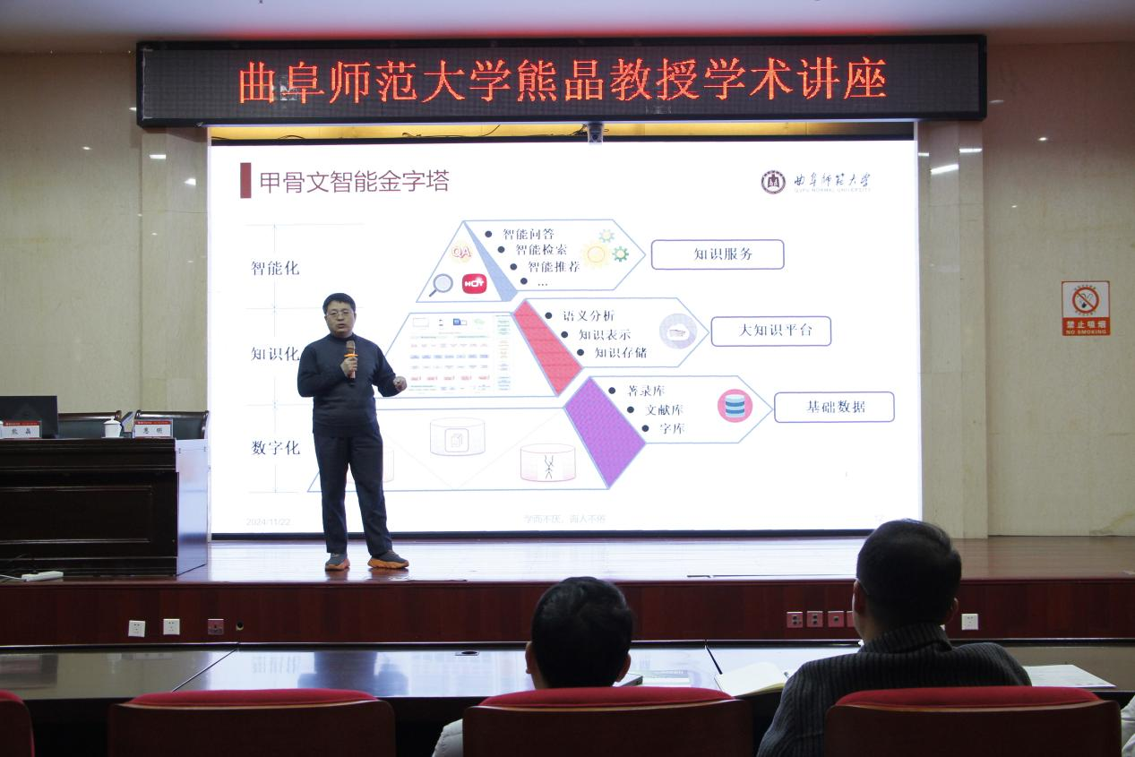 本网讯(通讯员 郭康达 张君/文 丁瑞祥/图)11月22日上午,应人工智能与软件工程学院邀请,曲阜师范大学熊晶教授于西区图书馆报告厅为新葡萄官网师生作了题为“AI4OBI:人工智能时代的甲骨文信息处理研究新模式”的学术报告。本次报告会由人工智能与软件工程学院院长惠明主持,学院教师代表、全体研究生和部分本科生参加。