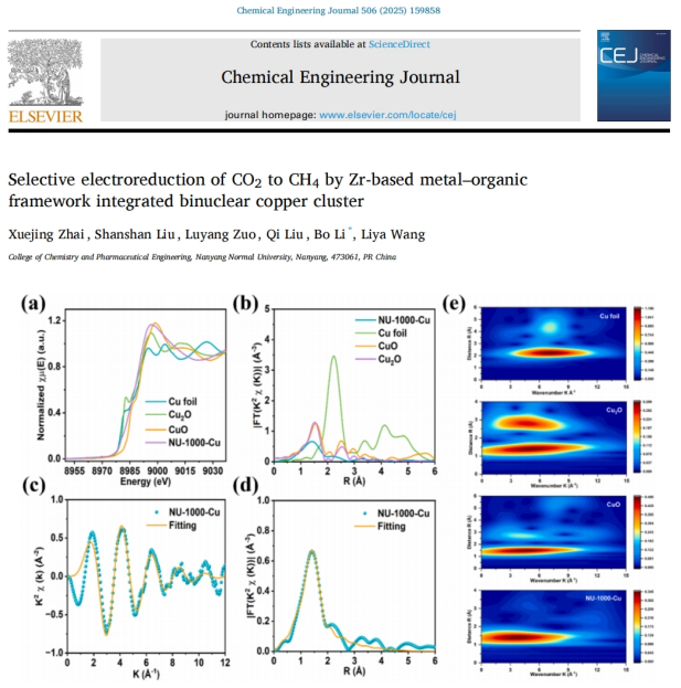 相关成果以“Selective electroreduction of CO2 to CH4 by Zr-based metal-organic framework integrated binuclear copper cluster”为题,发表在国际知名期刊《Chemical Engineering Journal》(IF=13.4,中科院大类1区,Top期刊)上,新葡萄8883官网AMG为唯一通讯单位,化学与制药工程学院2022级硕士研究生翟雪静为论文的第一作者,李波教授为唯一通讯作者。