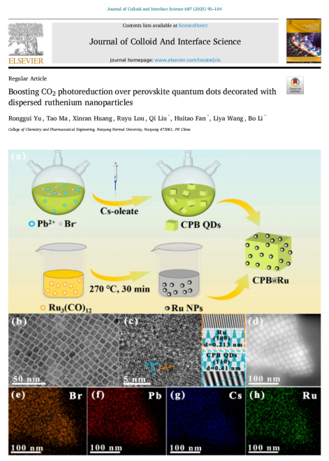 合成高效二氧化碳转化光催化材料是太阳能转化为碳燃料的理想选择。卤化物钙钛矿量子点(QDs)作为二氧化碳还原的潜在光催化剂,其主要面临的挑战是严重的电荷重组和激活二氧化碳的能力较弱。基于此,该团队2022级硕士研究生于荣桂等将分散的Ru纳米颗粒(Ru NPs)锚定在CsPbBr3(CPB)量子点表面,制备了CPB@Ru纳米复合材料。优化后的0.45% CPB@Ru,在没有任何牺牲剂和助催化剂的情况下,以28.12 umol g-1h-1的速率将CO2光催化还原为CO,约为CPB QDs(7.03 umol g-1h-1)的4倍。Ru NPs/ CPB界面形成的肖特基结加速了光生载流子的动态转移,促进了CO2的吸附和*COOH的生成,显著提高了光催化性能。本研究为利用金属纳米颗粒负载技术设计具有高选择性、高催化活性的钙钛矿光催化剂提供了一条有效的途径。