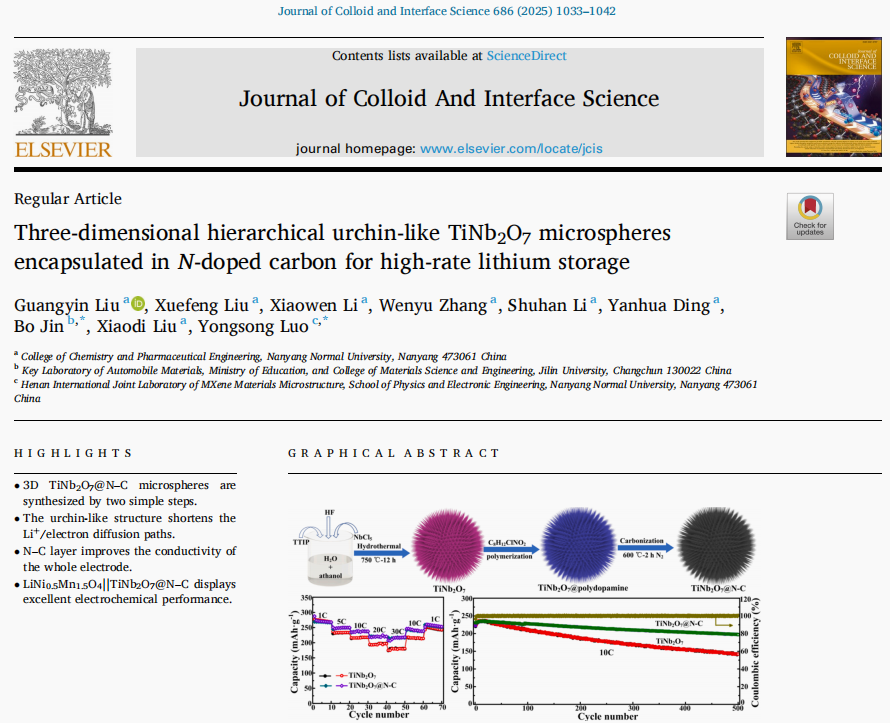 本网讯(通讯员 刘启 张君)近日,新葡萄官网化学与制药工程学院纳米储能材料研究团队与物理与电子工程学院新能源材料与器件团队合作在国际知名化学类期刊《Journal of Colloid And Interface Science》(中科院大类1区,TOP期刊,影响因子9.4)上发表题为“ Three-dimensional hierarchical urchin-like TiNb2O7microspheres encapsulated inN-doped carbon for high-rate lithium storage ”的研究论文。刘光印博士为论文第一作者,罗永松教授和吉林大学金波教授为通讯作者,新葡萄8883官网AMG为该论文的第一署名单位。