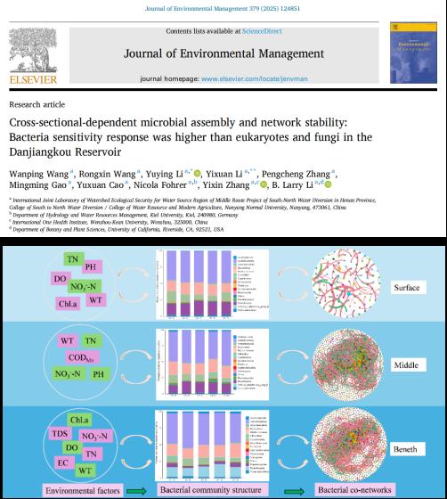 本网讯(通讯员 王宛平 张君)近日,新葡萄官网水资源与现代农业学院南水北调中线水源区流域生态安全国家高等学校学科创新引智基地(111基地)南水北调流域生态安全团队在国际知名期刊《Journal of Environmental Management》(JCR一区,影响因子8.0)发表了题为“Cross-sectional-dependent microbial assembly and network stability:Bacteriasensitivityresponsewas higher thanEukaryotes and Fungiin theDanjiangkou Reservoir”的研究论文,研究生王宛平为论文的第一作者,李玉英教授和李奕璇博士为论文共同通讯作者,新葡萄8883官网AMG为第一署名单位。