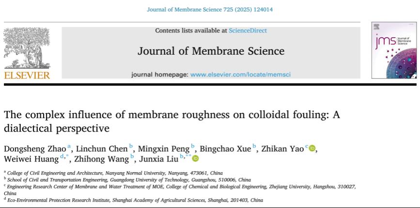 本网讯(通讯员 赵东升 鲁菁 张君)近日,新葡萄官网土木建筑工程学院南水北调中线水源区点面源污染控制与检测分析科研团队的研究成果分别以"The complex influence of membrane roughness on colloidal fouling: A dialectical perspective"和"Enhancing the filtration performance and antifouling ability of polyethylenimine-based nanofiltration membranes by doping with polyethylene glycol derivatives"为题在国际知名期刊JMS及SPT上发表。