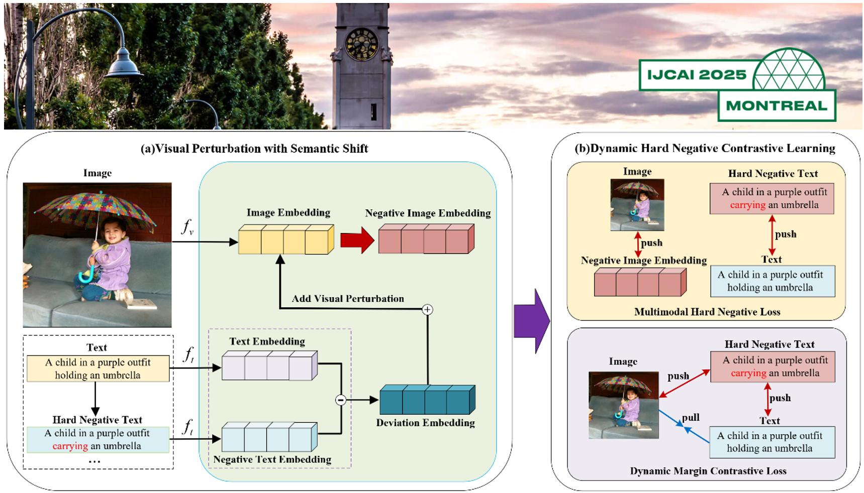 本网讯(通讯员 黄鑫 张君 郭康达 )近日,新葡萄官网人工智能与软件工程学院大数据与人工智能团队与北京大学人工智能学院的合作研究成果《Visual Perturbation and Adaptive Hard Negative Contrastive Learning for Compositional Reasoning in Vision-Language Models》在人工智能领域顶级学术会议IJCAI 2025(The 34th International Joint Conference on Artificial Intelligence)录用。论文第一作者为新葡萄官网黄鑫博士,通讯作者为新葡萄官网王亚博士,新葡萄8883官网AMG为第一通讯单位。