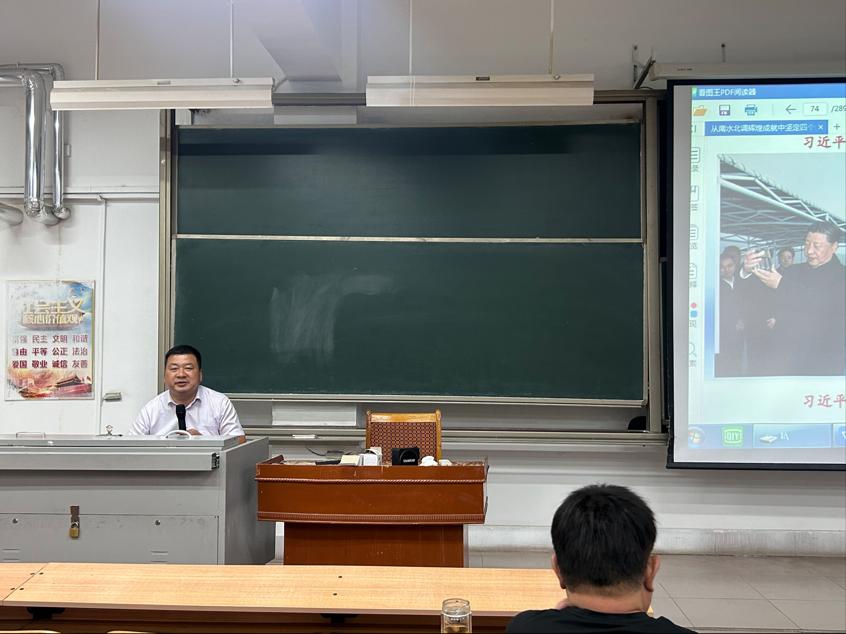 卢忠哲教授以南阳是南水北调中线工程的核心水源地和渠首所在地为切入点,为同学们展示了南水北调工程在解决北方水资源短缺问题上发挥的关键作用。他通过详实的数据和鲜活的事例,分别介绍了南水北调工程东、中、西三条线路,以及工程建设、运行以来取得的显著成效。他表示,南水北调工程作为世界最大跨流域调水工程,是中国共产党为人民谋幸福、为民族谋复兴的生动实践,充分体现了党的初心和使命,以及中国特色社会主义制度的显著优势。卢忠哲倡导同学们要深入学习贯彻习近平总书记关于南水北调工程的重要指示精神,充分发挥南水北调工程的思政教育作用,挖掘工程背后的感人故事和伟大精神,从而进一步坚定“道路自信、理论自信、制度自信、文化自信”。