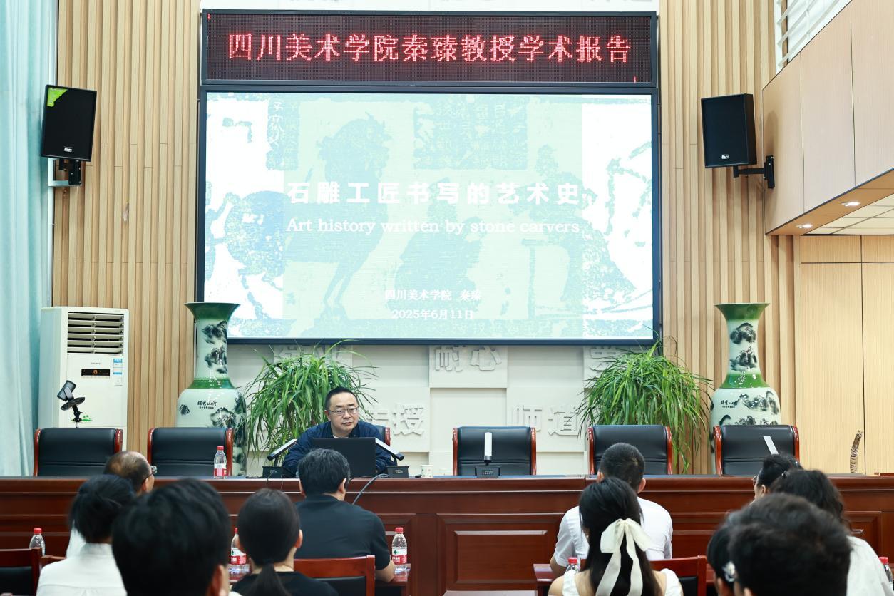 本网讯(张鑫/文 吕星意/图)6月11日上午,应美术与艺术设计学院邀请,四川美术学院中国画与书法艺术学院教授、大足学中心主任秦臻在美术与艺术设计学院三楼会议室作题为“石雕工匠书写的艺术史”的学术报告。报告由学院副院长陈晅嵘主持,学院领导、文学院、历史学院、南阳市科学院工艺美术研究所师生代表共120余人参加。