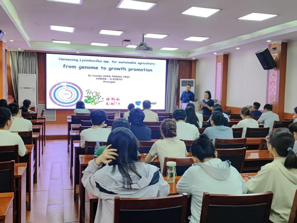 会议伊始,李丹丹向Camilo教授表达了热烈的欢迎与感谢,并向与会师生详细介绍了Camilo教授在农业害虫防控和可持续发展农业的创新生物技术解决方案领域取得的最新研究成果。随后,Camilo教授以棕榈组织中分离出的赖氨酸芽孢杆菌新菌株为例,详细阐释了该菌株通过营养活化、激素调控和抗逆诱导等多重机制促进植物生长发育的分子基础,展示了其在盆栽试验中取得的显著促生效果,并提出了一个利用基因组学分析技术加速开发适应气候变化、减少合成化学品依赖、低投入农业的微生物肥料新策略。在互动环节,与会师生围绕“新一代智能化微生物肥料研发”“绿色农业转型”等议题展开了深入探讨,现场学术氛围浓厚。