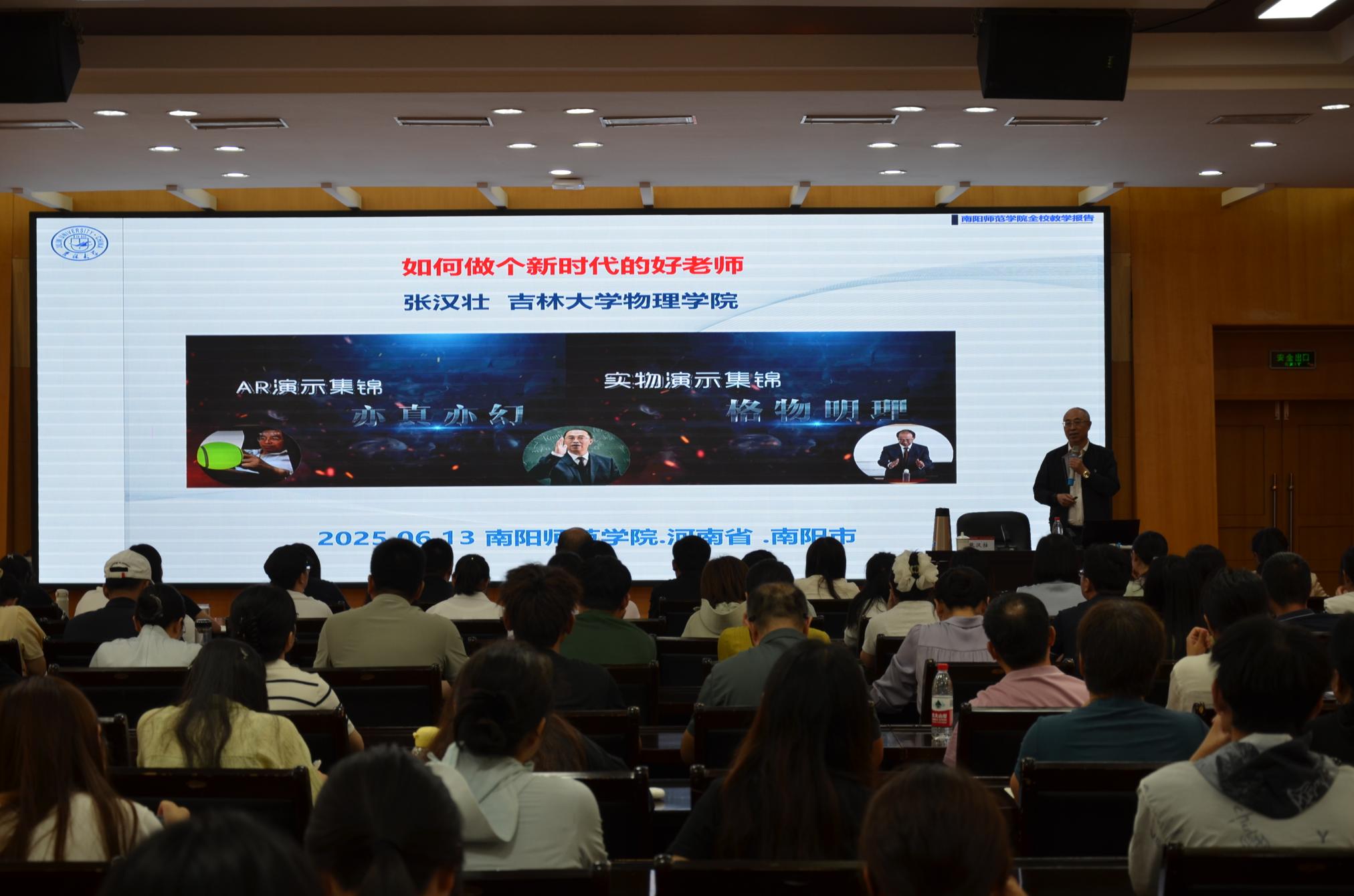 本网讯(通讯员 王志鹏 张君)6月13日上午,国家级教学名师、吉林大学张汉壮教授受邀来访物理与电子工程学院,为全校教师和师范生带来一场名师报告。报告题目为“如何做个新时代的好老师”,教务处副处长郭欣、侯书进,物理与电子工程学院院长朱永胜,以及各学院教师、师范生共计200余人参加。报告会由郭欣主持。