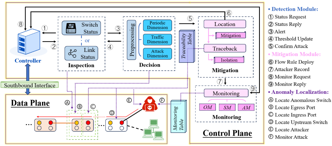 针对这一难题,团队提出了一种兼具检测精度、实时性与可解释性的双向检测与可追溯缓解方案。该方案创新性地设计了多维度、双向特征匹配机制,精准识别攻击流量,有效弥补了现有缓解策略的漏洞。同时,通过对攻击者行为的持续追踪与预测,实现了更高效、更彻底的攻击防御。该方案在检测准确率、响应速度、资源消耗等方面均优于现有主流方法,具有广泛的应用前景和推广价值。