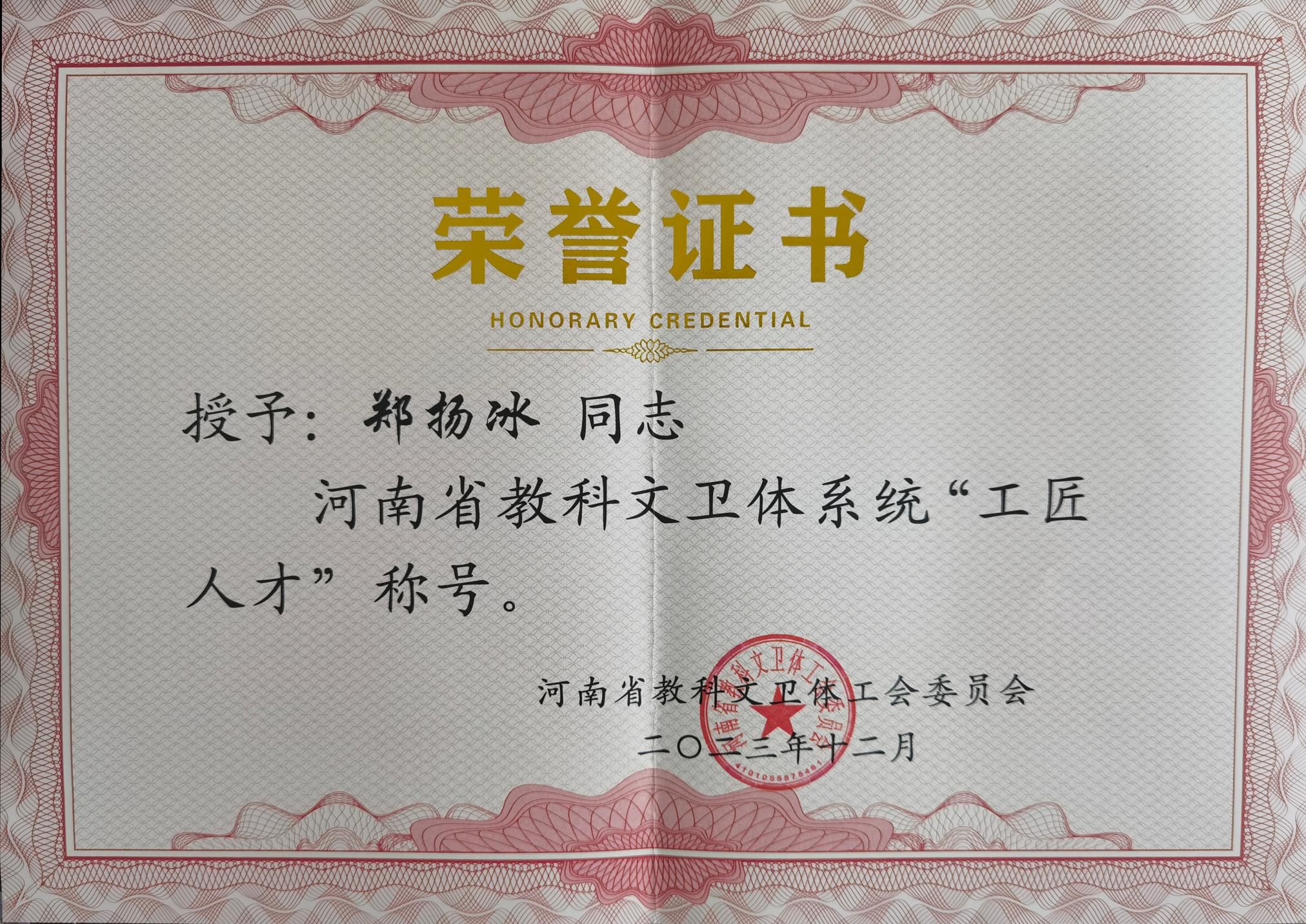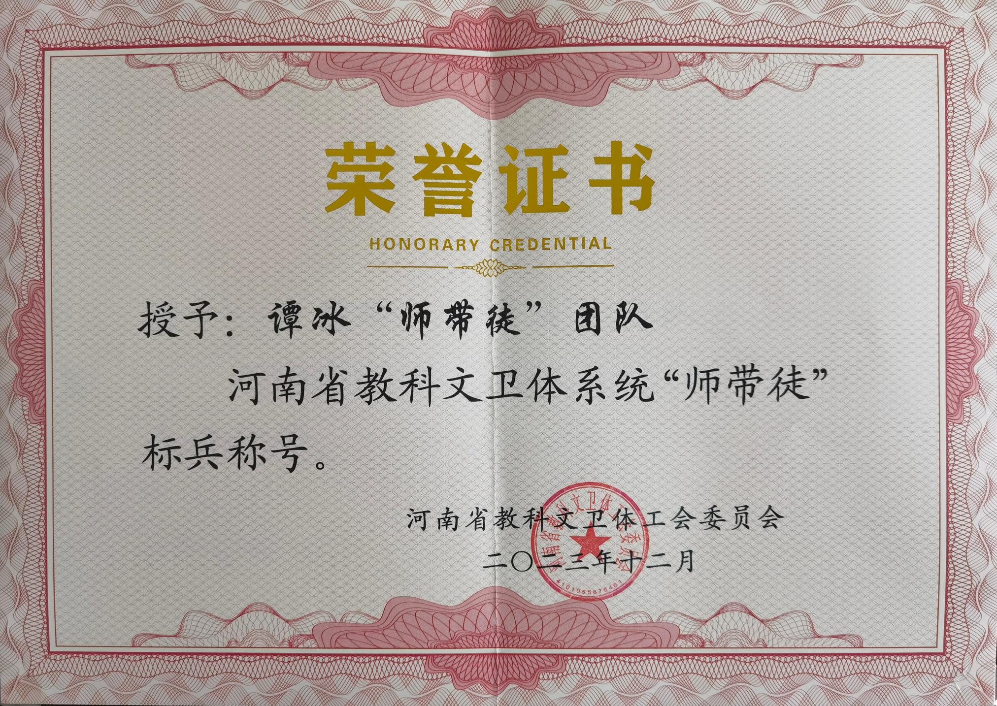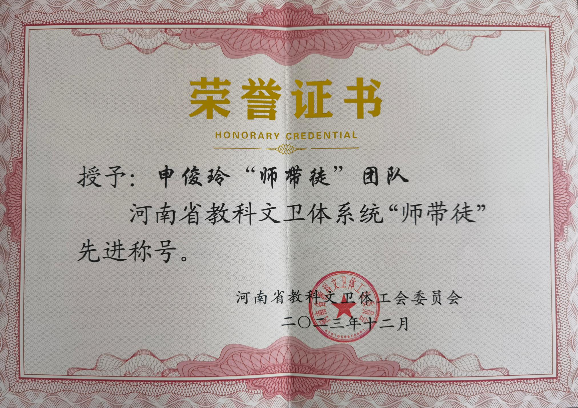 本网讯(通讯员 高宛莉 文/图)近日,河南省教科文卫体系统下发《关于命名河南省教科文卫体系统示范性劳模和工匠人才创新工作室、优秀工匠人才、“师带徒”标兵的决定》(豫教科文卫体工[2023]31号)、《关于命名河南省教科文卫体系统劳模和工匠人才创新工作室、工匠人才、“师带徒”先进的决定》(豫教科文卫体[2023]32号),新葡萄官网选拔推荐的数学与统计学院分会谭冰“师带徒”团队被授予河南省教科文卫体系统“师带徒”标兵称号,经济与管理学院分会申俊玲“师带徒”团队被授予河南省教科文卫体系统“师带徒”先进称号,行政分会郑扬冰荣获河南省教科文卫体系统“工匠人才”称号。