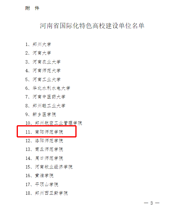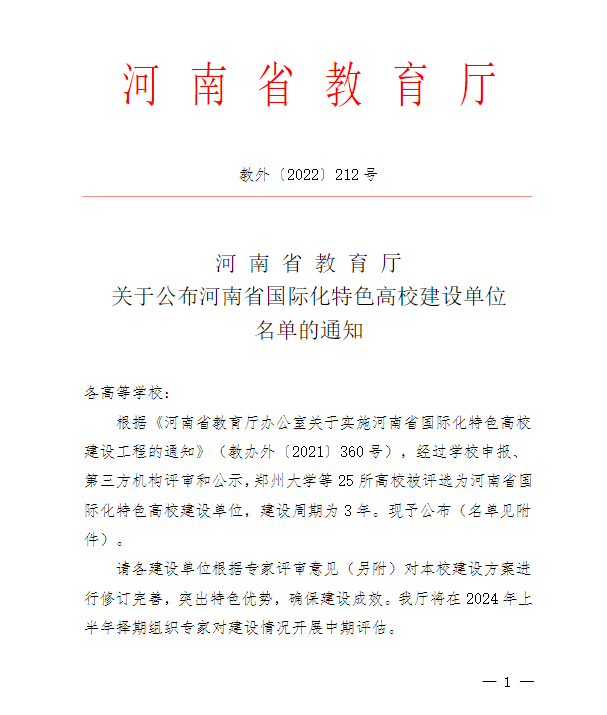 本网讯(通讯员 王志平)近日,河南省教育厅印发《关于公布河南省国际化特色高校建设单位名单的通知》,新葡萄官网被评选为河南省国际化特色高校建设单位。这是新葡萄官网国际化建设方面取得的又一新的突破。据悉,此次是我省首次立项建设国际化特色高校,全省仅25所。