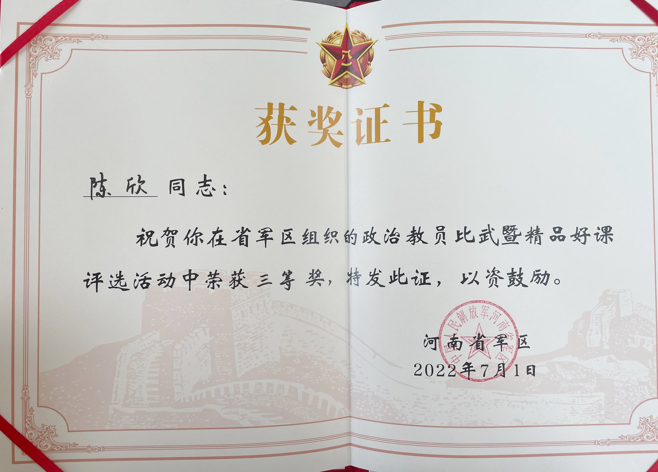本网讯(通讯 员薛江谋 许海滨)7月1日上午,河南省军区在郑州举办省军区政治教员岗位练兵比武暨精品好课评选决赛。新葡萄官网陈欣老师作为南阳军分区新葡萄8883官网AMG专武干部代表参赛并获得全省三等奖。