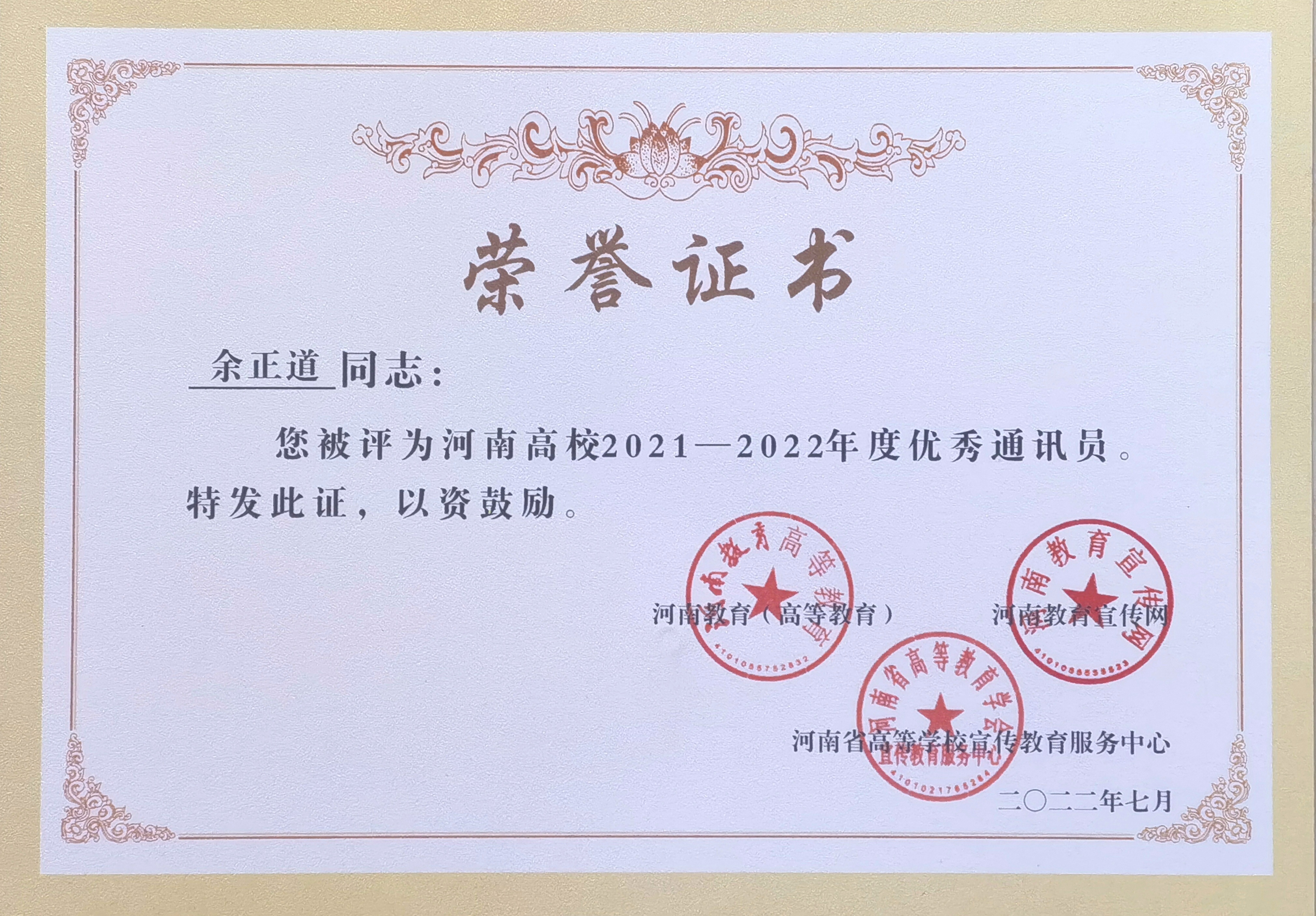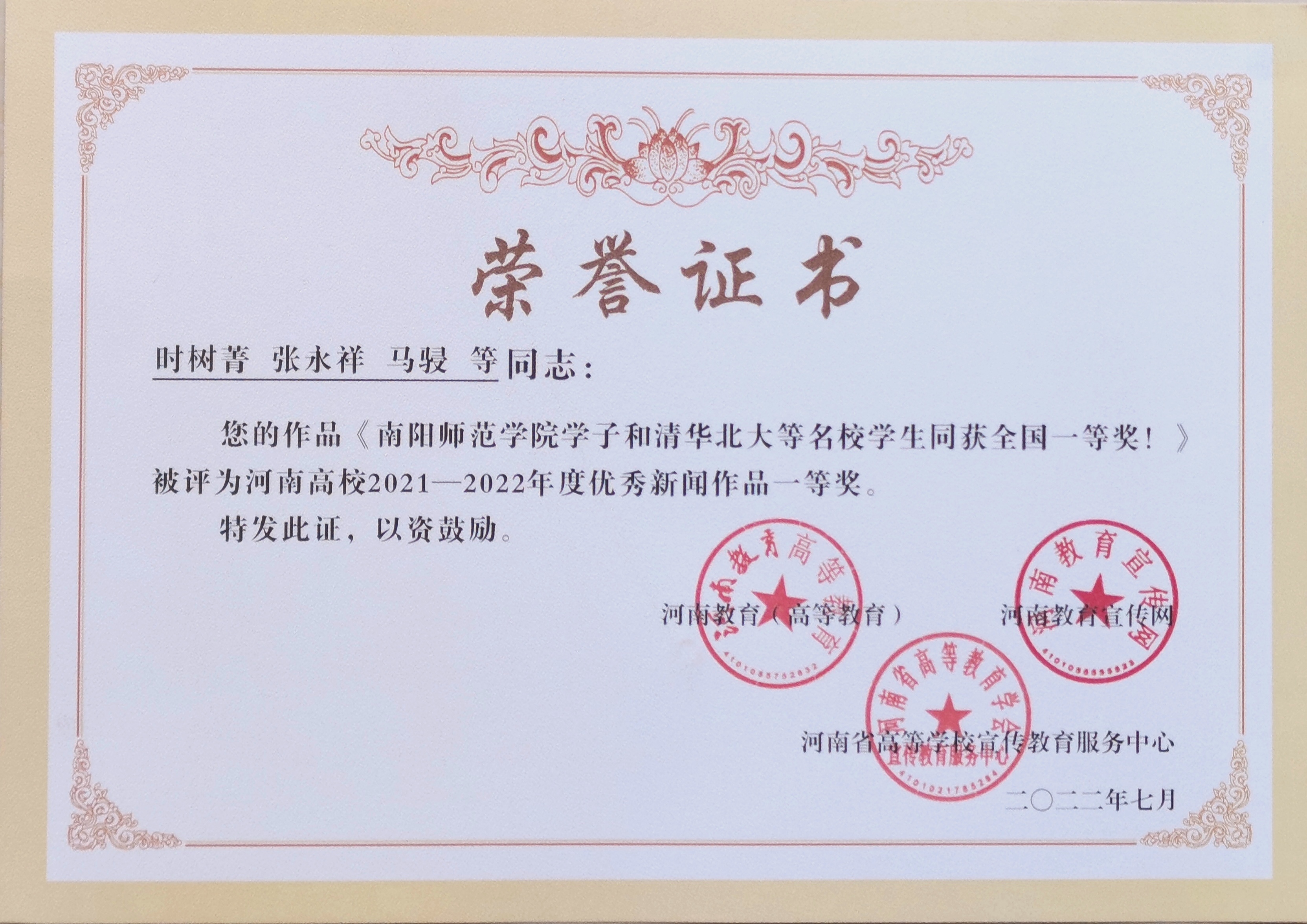 本网讯(王长宇/文 余正道/图)7月10-15日,由《河南教育》(高等教育)杂志、河南教育宣传网、河南省高等学校宣传教育服务中心联合主办的宣传工作研修班暨河南高教融媒体理事会2022年年会在西昌举行。会上表彰了河南高校2021-2022年度宣传先进单位,经学校申报推荐、专家组集中评审等程序,新葡萄官网荣获河南高校2021-2022年度宣传先进单位卓越奖,时树菁、张永祥、马骎老师的作品《新葡萄8883官网AMG学子和清华北大等名校学生同获全国一等奖》荣获优秀新闻作品一等奖,余正道、李旭老师的作品《新葡萄8883官网AMG举行河南省副中心城市研究院揭牌仪式》荣获优秀新闻作品三等奖,余正道老师获“优秀通讯员”称号。