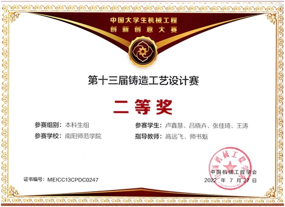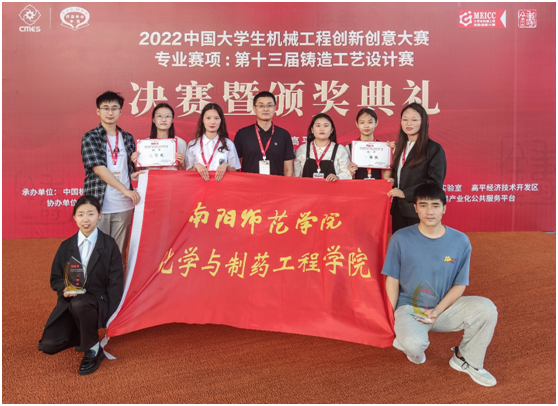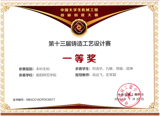 第十三届中国大学生铸造工艺设计大赛由中国机械工程学会主办,中国机械工程学会铸造分会承办。本届大赛吸引了来自哈尔滨工业大学、华中科技大学、北京科技大学、吉林大学、东北大学等101所高校的2956名选手、835份作品报名参赛。经过答辩评审和知识竞赛,由新葡萄官网化学与制药工程学院教师高远飞、左军超指导的邓清华、凡敏、郑璇、屈琳团队获得全国一等奖,高远飞、师书魁指导的卢鑫慧、吕晓卉、张佳琦、王涛团队获得全国二等奖。