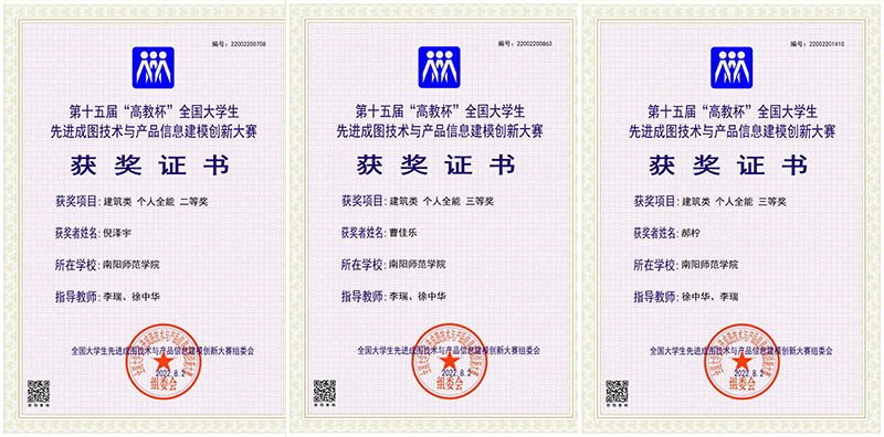 本网讯(通讯员 徐中华)近期,第十五届“高教杯”全国大学生先进成图技术与产品信息建模创新大赛全国总决赛在江苏大学落下帷幕。新葡萄官网土木建筑工程学院由徐中华、李瑞老师指导的5位学生组成代表队,认真备赛,历经校赛、省赛和国赛三个阶段,取得了建筑类个人全能二等奖1项、三等奖2项的好成绩。