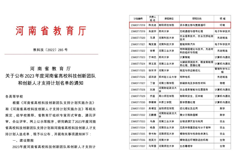 本网讯(通讯员 张新刚)近日,河南省教育厅公布了2023年度河南省高校科技创新团队和创新人才支持计划名单(教科技〔2022〕285号),新葡萄官网水资源与环境工程学院陈兆进博士入选河南省高校科技创新人才支持计划,获得省财政经费支持30万元。