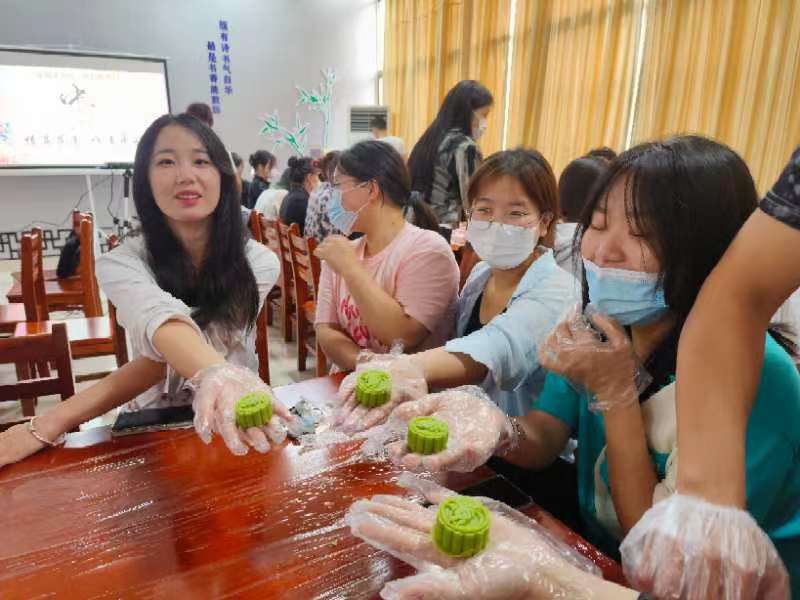 图书馆副馆长贾虹致辞,鼓励绿茵读书会砥砺前行,更上一层楼,并且为大家带来了情深意长的歌曲《想你的时候问月亮》。绿茵读书会指导老师王莫离声情并茂地朗诵了诗歌《中秋月》。随后,全体师生开始自制手工月饼,大家亲自和面、包馅、踏模具,看着自己亲手制作的月饼,同学们喜不自禁,彼此分享。丁涛同学朗诵了《春江花月夜》,贾梦瑶同学带来一首《水调歌头.明月几时有》,以月亮为主的飞花令、猜谜语等活动精彩纷呈,同学们踊跃参与,纷纷讲述自己家乡的中秋习俗,现场气氛活跃,高潮迭起。最后全体师生在主持人的带领下朗读了《水调歌头·明月几时有》,寄托了大家对亲人的思念,以及对祖国和家人的祝福。