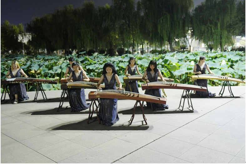 10月1日、3日,音乐学院组织古筝专业师生在阳子湖畔进行古筝表演。他们奏响《我的祖国》《歌唱祖国》等经典曲目,用曼妙的筝声献礼祖国,引起了校园里师生驻足观看。