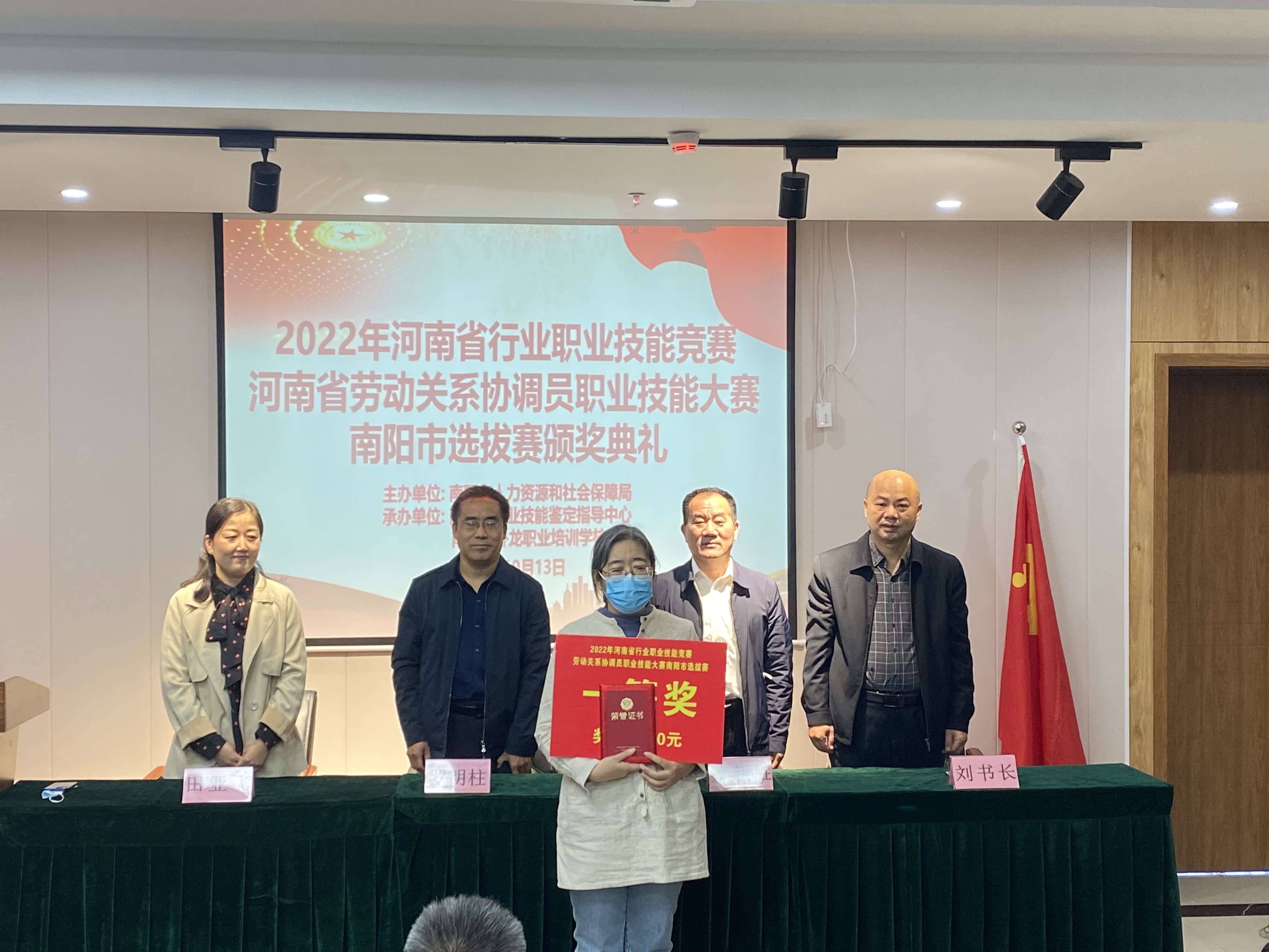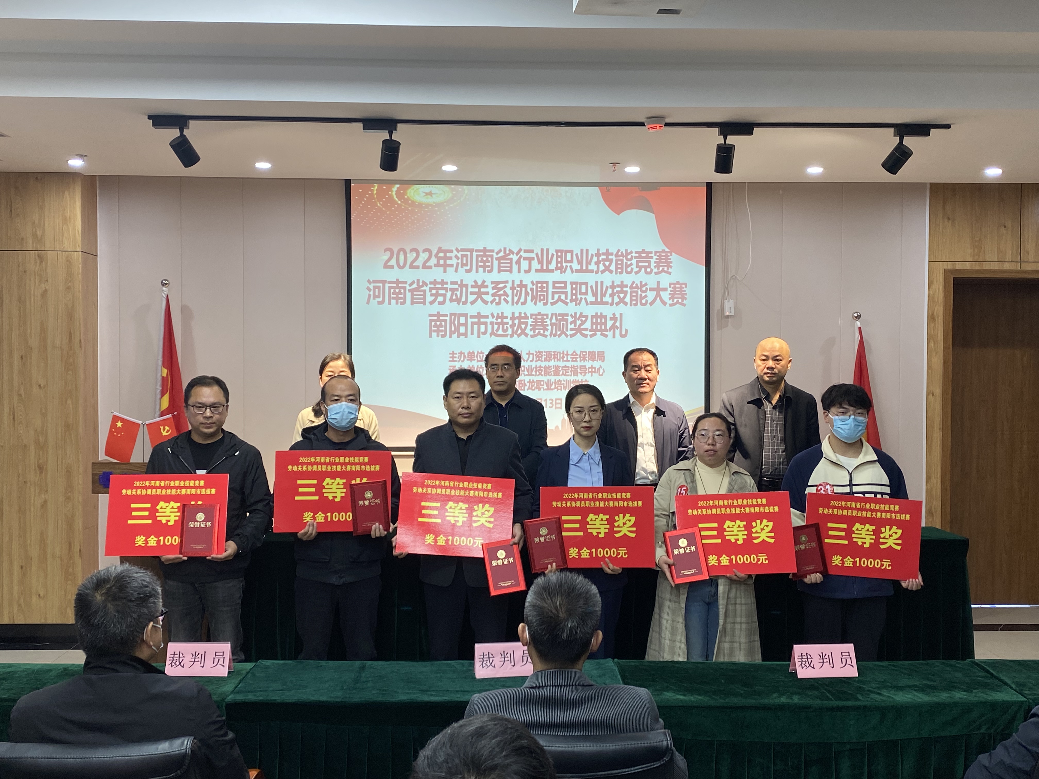 本网讯(李文彬/文 张硕/图)为贯彻落实习近平总书记对技能人才工作的重要指示批示精神,高质量推进“人人持证、技能河南”建设,10月13日,南阳市人力资源和社会保障局举办2022年河南省行业职业技能竞赛河南省劳动关系协调员职业技能大赛南阳选拔赛。新葡萄官网法学院钟君老师、经济与管理学院李翠老师和法学院张硕、高婷同学组队参赛,最终钟君老师喜获全市第一名的好成绩,李翠老师和张硕同学荣获三等奖。