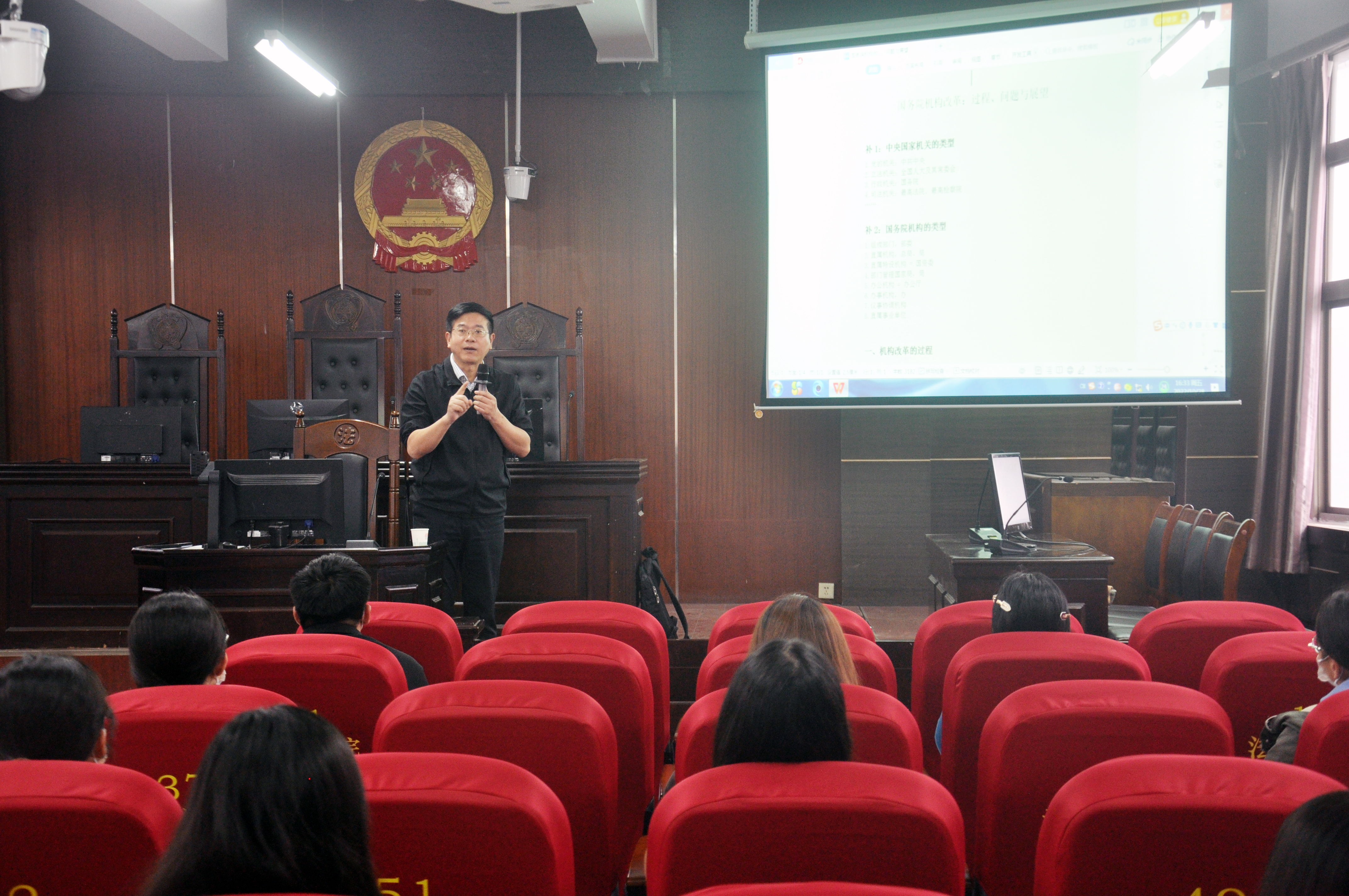 讲座现场,吴鹏老师向同学们讲述了新中国成立以来,党和政府为建立和完善结构合理、人员精干、灵活高效的党政机关进行的坚持不懈的努力,进行过多次精兵简政,借此引出国务院机构改革的主线,介绍了国务院机构改革的过程,并结合自己参与部分机构改革方案论证的经历,帮助同学们更好地理解了国务院机构改革的历史。吴鹏老师从学术层面分析了国务院机构改革存在的问题,即机动变动次数多且变动大、改革缺乏总体性和长期性、改革方案缺乏科学性和有效性,并且表达了他对国务院机构改革的展望。(编审 余正道)