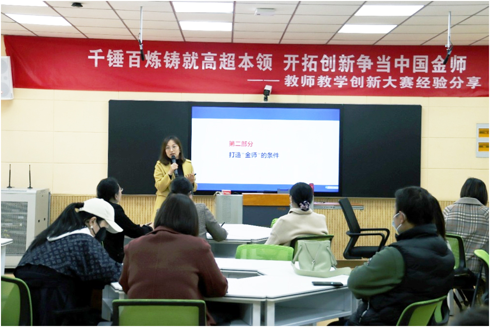 胡鹏老师以“千锤百炼铸就高超本领,开拓创新争当中国金师”为主题,从打造“金师”的意义、打造“金师”的条件、“金师”应该怎么做、“金师”路上任重道远等4个方面为老师们进行了鞭辟入里的讲解,分享了教师教学创新大赛经验,围绕“教学创新从哪几方面进行创新”与教师们进行了深入的交流与探讨。(编审 余正道)