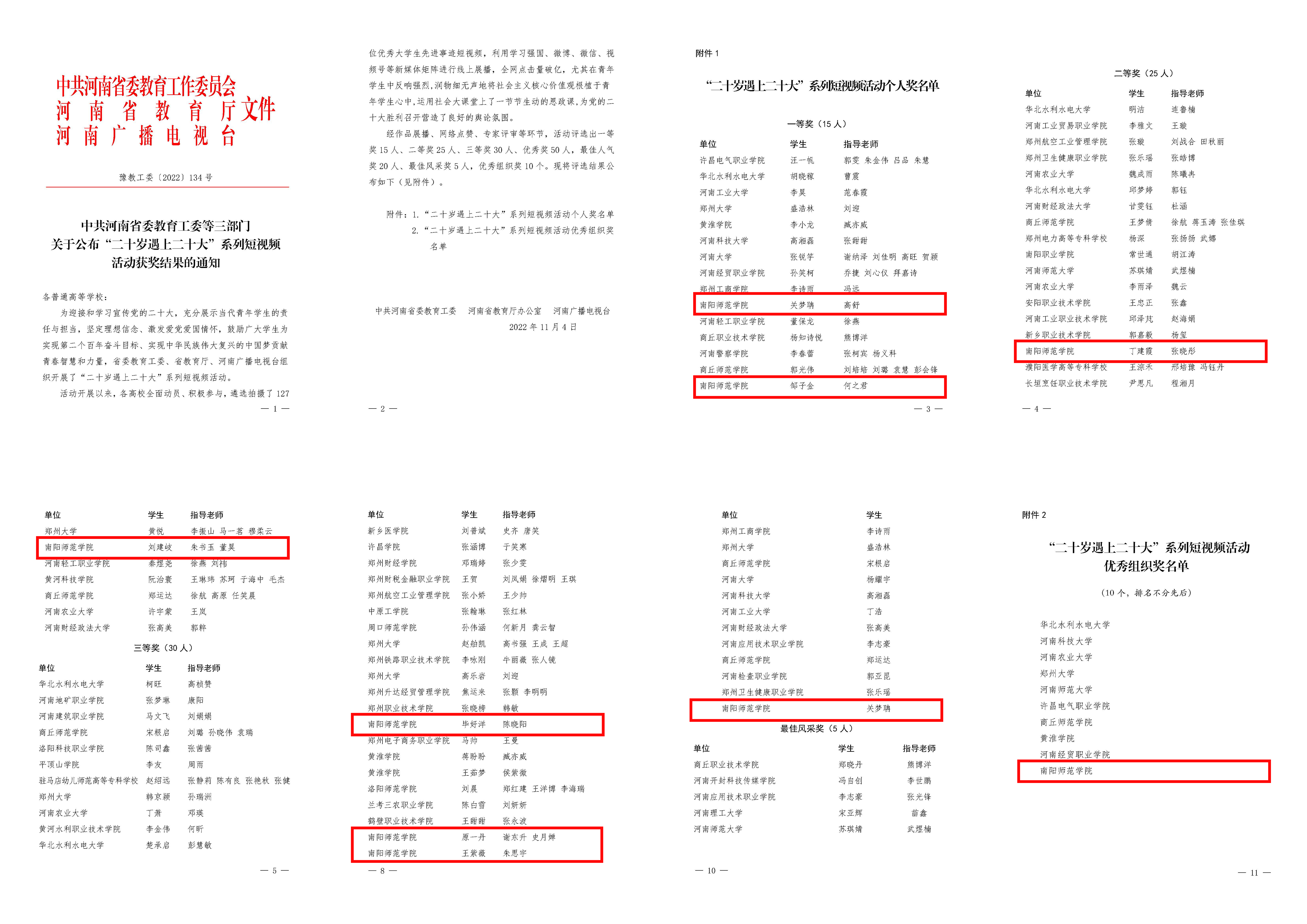 本网讯(通讯员 何之君 李珂 张苏文)近日,由中共河南省委教育工作委员会、河南省教育厅办公室、河南广播电视台举办的“二十岁遇上二十大”系列短视频活动获奖结果公布。新葡萄官网荣获优秀组织奖。新葡萄官网学子关梦聃、邹子金荣获一等奖;丁建霞、刘建岐荣获二等奖;毕好洋、原一丹、王紫薇荣获优秀奖;关梦聃荣获最佳人气奖。