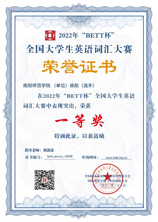 本网讯(刘潇潇/文 侯航/图)近日,2022年“BETT杯”全国大学生英语词汇大赛成绩揭晓。音乐学院2022级9班音乐学专业侯航同学在刘潇潇老师的悉心指导下,克服疫情期间的种种困难,在比赛中发挥所长,最终荣获一等奖。