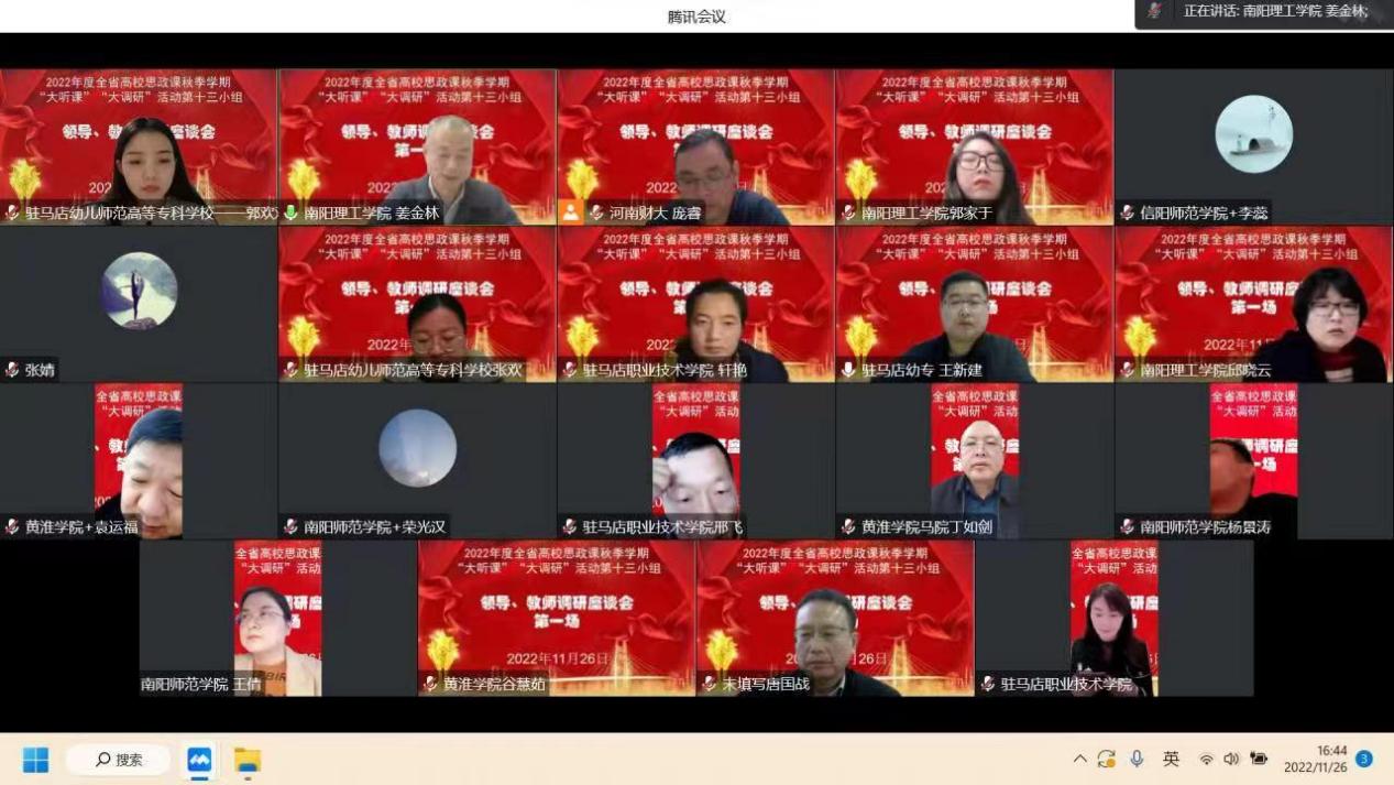 本网讯(通讯员 王倩)根据河南省委教育工委、河南省教育厅《关于开展2022年度全省高校思政课秋季学期“大听课”“大调研”活动的通知》(教思政函[2022]654号)安排,11月21日-26日,省第十三调研组以线上方式对新葡萄官网思政课教学工作进行深入调研。