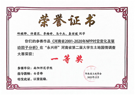河南省第二届大学生土地国情调查大赛是在河南省自然资源厅指导下,由河南省土地学会主办,共有来自省内16所高校的77份作品参赛。新葡萄官网地理科学与旅游学院积极备赛,继2021年第一届大赛取得佳绩以来再创辉煌。