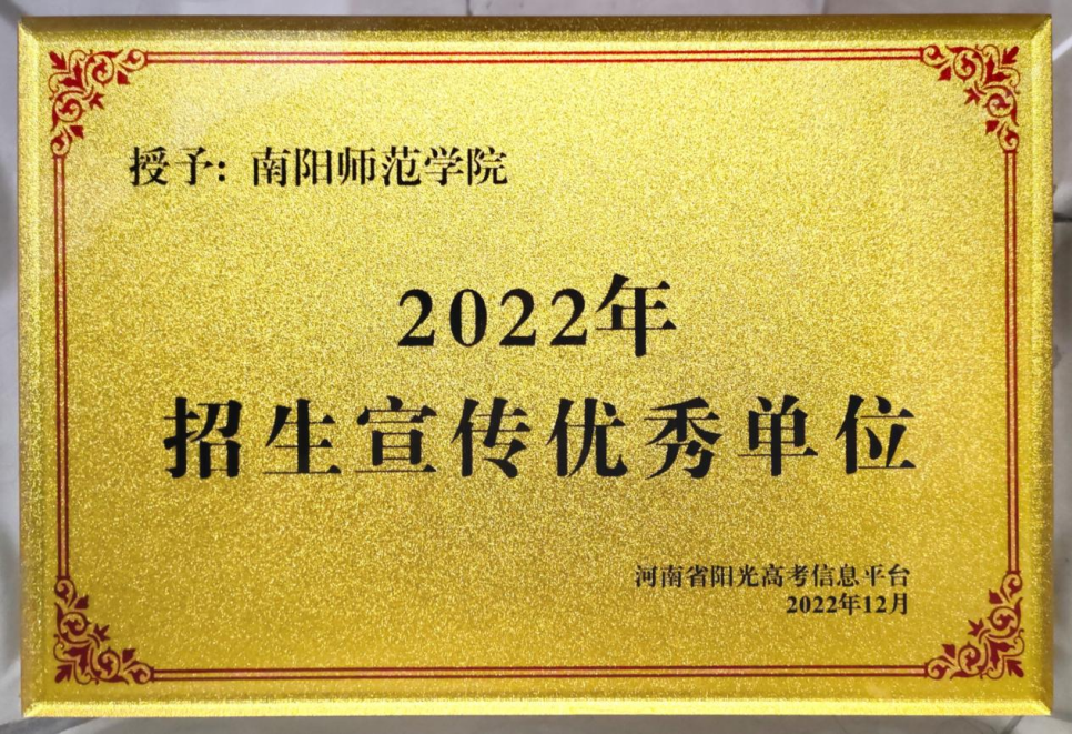 本网讯(通讯员 马春蕾 图/文)近日,河南省阳光高考信息平台授予新葡萄官网“河南省2022年招生宣传优秀单位”荣誉称号。新葡萄官网已连续三年获此殊荣。